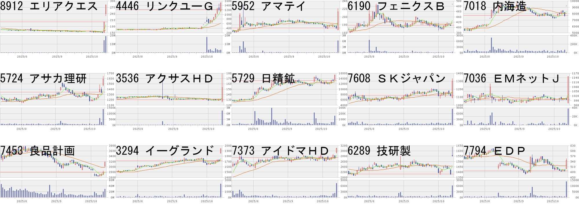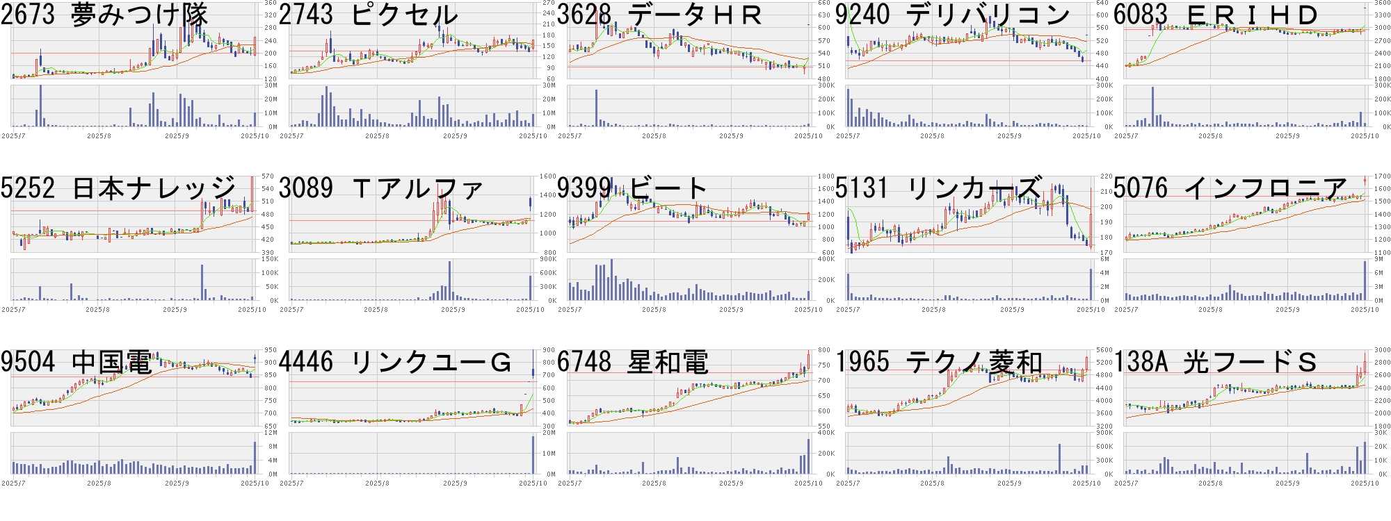 コード,銘柄名,市場,株価,前日比,前日比.1,出来高,PER,PBR,利回り2673,夢みつけ隊,東S,249.0,50.0,+25.13%,9846200,42.0,1.01,-2743,ピクセル,東S,166.0,30.0,+22.06%,8678300,-,-,-3628,データHR,東G,607.0,100.0,+19.72%,15800,12.2,80.29,-9240,デリバリコン,東G,536.0,80.0,+17.54%,2900,19.9,2.33,-6083,ERIHD,東S,3460.0,503.0,+17.01%,24400,15.5,3.96,2.025252,日本ナレッジ,東G,567.0,80.0,+16.43%,11400,29.8,2.19,1.763089,Tアルファ,東S,1290.0,162.0,+14.36%,522500,-,1.02,2.719399,ビート,東S,1215.0,125.0,+11.47%,82666,-,-,-5131,リンカーズ,東G,195.0,20.0,+11.43%,4406700,-,2.41,-5076,インフロニア,東P,1672.5,133.5,+8.67%,8305400,8.6,1.00,4.669504,中国電,東P,915.0,71.7,+8.50%,9085800,5.1,0.46,2.304446,リンクユーG,東P,699.0,53.0,+8.20%,17735300,32.2,3.83,-6748,星和電,東S,784.0,59.0,+8.14%,329800,8.1,0.58,2.301965,テクノ菱和,東S,5350.0,390.0,+7.86%,169900,11.4,2.05,1.94138A,光フードS,東G,2812.0,176.0,+6.68%,22700,26.3,2.15,1.42コード,銘柄名,市場,株価,前日比,前日比.1,出来高,PER,PBR,利回り7985,ネポン,東S,1580,-472,-23.00%,73300,37.8,0.73,0.76334A,VPJ,東G,1878,-500,-21.03%,258200,24.0,2.68,0.849213,セイファート,東S,1152,-300,-20.66%,512300,33.1,1.47,1.04219A,ハートシード,東G,2050,-500,-19.61%,49400,509,6.50,-2628,iFE科創板,東E,3180,-700,-18.04%,79740,-,-,-2629,iFEGBA,東E,7805,-1500,-16.12%,1290,-,-,-3997,Tワークス,東S,289,-53,-15.50%,1328600,112,6.72,0.697105,ロジスネクス,東S,1555,-260,-14.33%,3608600,15.1,1.39,-4255,THECOO,東G,1093,-177,-13.94%,12600,38.3,5.86,-6380,オリチェン,東S,2478,-401,-13.93%,11800,32.1,1.86,1.214937,ワクー,東G,1210,-195,-13.88%,49900,118,2.14,-6177,アップバンク,東G,189,-30,-13.70%,12172100,-,32.64,-5246,エレメンツ,東G,882,-128,-12.67%,2630600,-,12.76,-9561,グラッドC,東G,546,-76,-12.22%,406600,-,6.58,-8105,堀田丸正,東S,615,-82,-11.76%,3879600,1160,13.34,-にほんブログ村