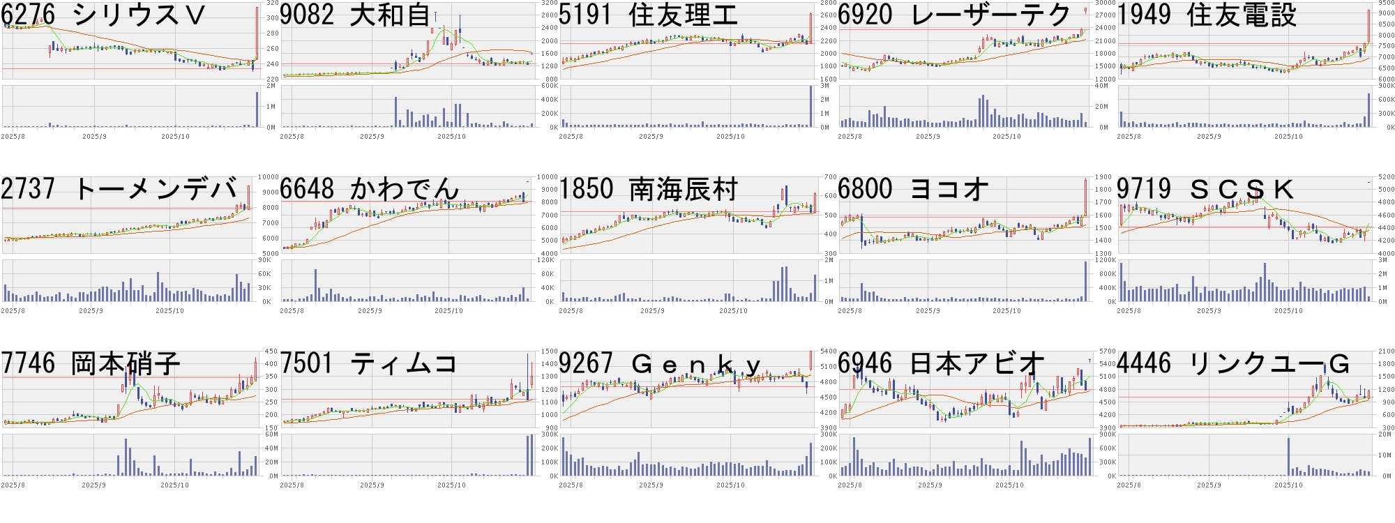 コード,銘柄名,市場,株価,前日比,前日比.1,出来高,PER,PBR,利回り6276,シリウスV,東S,313,80,+34.33%,1639900,-,0.79,-9082,大和自,東S,1572,300,+23.58%,43500,140,0.77,0.515191,住友理工,東P,2615,459,+21.29%,2921400,12.8,1.22,1.306920,レーザーテク,東P,28575,5000,+21.21%,4130300,42.8,12.25,1.151949,住友電設,東P,9120,1500,+19.69%,713800,21.4,2.69,0.862737,トーメンデバ,東P,9400,1500,+18.99%,38200,10.0,1.23,3.196648,かわでん,東S,9590,1500,+18.54%,7700,11.8,1.7,3.021850,南海辰村,東S,610,94,+18.22%,1266400,11.6,0.98,0.986800,ヨコオ,東P,1868,287,+18.15%,1129900,27.2,0.85,2.579719,SCSK,東P,5107,773,+17.84%,347800,25.2,5.06,0.927746,岡本硝子,東S,404,58,+16.76%,27657000,585,6.61,-7501,ティムコ,東S,1300,180,+16.07%,293400,-,0.73,0.929267,Genky,東P,5400,705,+15.02%,231900,21.9,2.99,0.246946,日本アビオ,東S,5500,705,+14.70%,809700,29.5,6.19,0.184446,リンクユーG,東P,1151,144,+14.30%,1764400,53.0,6.3,-コード,銘柄名,市場,株価,前日比,前日比.1,出来高,PER,PBR,利回り2459,アウン,東S,404,-80,-16.53%,2790200,-,9.81,-9251,AB&C,東G,1118,-206,-15.56%,796000,12.6,1.79,5.374366,ダイトーケミ,東S,270,-47,-14.83%,846100,11.3,0.56,2.963974,SCAT,東S,499,-68,-11.99%,113300,13.3,0.79,2.684832,JFEシステ,東S,1925,-250,-11.49%,162900,15.5,1.79,3.537265,エイケン工業,東S,3415,-425,-11.07%,26700,12.0,0.58,3.224450,パワーソリュ,東G,2288,-281,-10.94%,46300,21.4,2.09,1.096022,赤阪鉄,東S,4935,-605,-10.92%,109100,94.4,0.68,-7827,オービス,東S,1506,-181,-10.73%,90300,6.7,0.48,3.787640,トップカルチ,東S,175,-21,-10.71%,370700,-,-,-3419,アートG,名N,1820,-209,-10.30%,9600,2141,3.93,-7419,ノジマ,東P,1171,-122,-9.44%,3549300,8.4,1.50,1.341840,土屋HD,東S,240,-25,-9.43%,364900,1263,0.51,4.178912,エリアクエス,東S,161,-15,-8.52%,482000,17.9,1.86,1.863475,グッドコムA,東P,1399,-126,-8.26%,1514900,10.8,3.03,3.22にほんブログ村