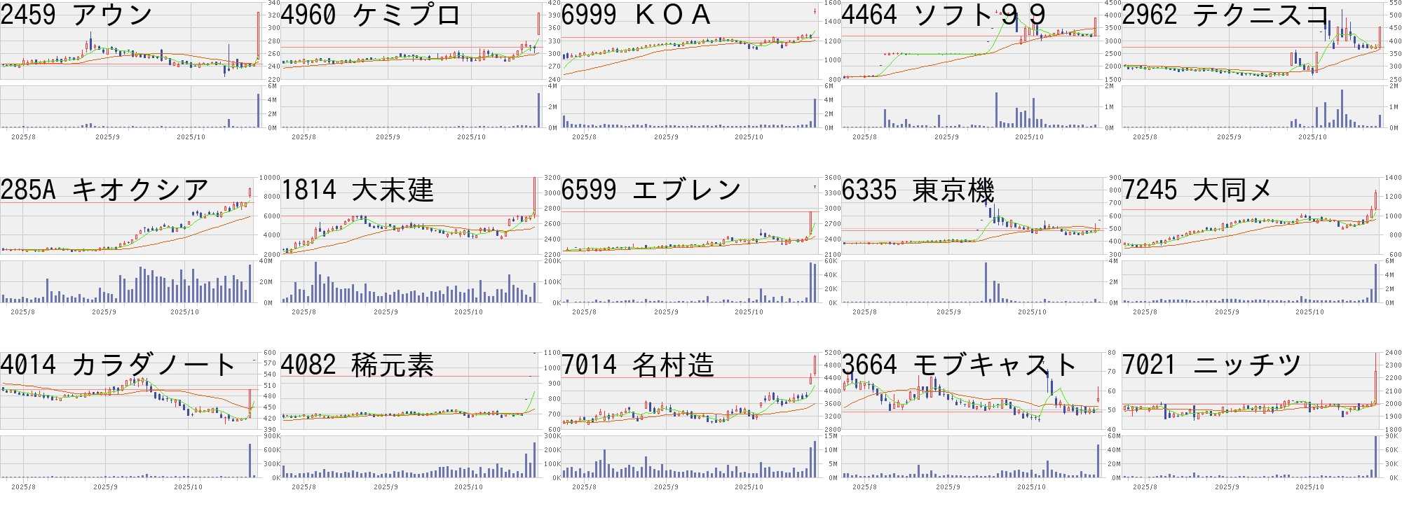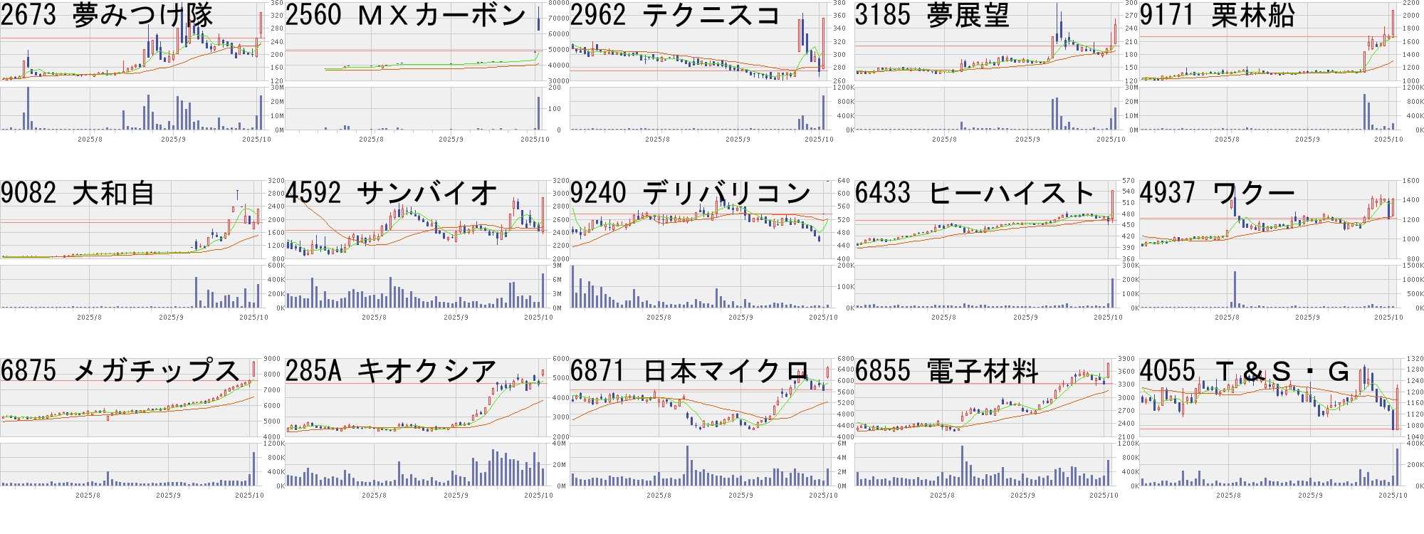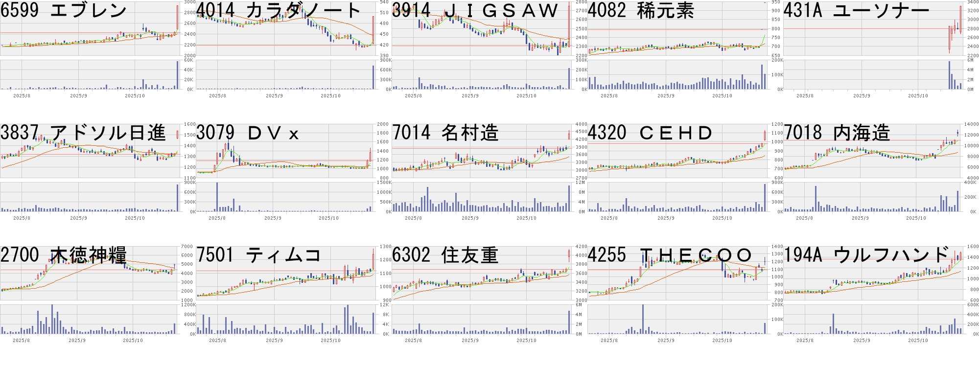 コード,銘柄名,市場,株価,前日比,前日比.1,出来高,PER,PBR,利回り2673,夢みつけ隊,東S,329,80,+32.13%,23843500,55.5,1.34,-2560,MXカーボン,東E,62600,14420,+29.93%,153,-,-,-2962,テクニスコ,東S,355,80,+29.09%,945600,108,2.01,-3185,夢展望,東G,249,49,+24.50%,15354600,-,13.99,-9171,栗林船,東S,2070,400,+23.95%,163300,6.7,0.82,1.219082,大和自,東S,2310,400,+20.94%,323400,206,1.13,0.354592,サンバイオ,東G,2931,500,+20.57%,7174600,-,195,-9240,デリバリコン,東G,636,100,+18.66%,11200,23.6,2.76,-6433,ヒーハイスト,東S,542,80,+17.32%,202900,99.4,1.22,0.374937,ワクー,東G,1407,197,+16.28%,48500,137,2.49,-6875,メガチップス,東P,8770,1190,+15.70%,923200,35.5,1.07,1.60285A,キオクシア,東P,5410,705,+14.98%,15631000,-,3.84,-6871,日本マイクロ,東P,6460,800,+14.13%,2337500,27.2,4.82,1.116855,電子材料,東S,3785,460,+13.83%,710800,19.2,1.71,1.324055,T&S・G,東G,1213,147,+13.79%,341500,18.7,3.37,0.82コード,銘柄名,市場,株価,前日比,前日比.1,出来高,PER,PBR,利回り2629,iFEGBA,東E,4514,-3291,-42.17%,69093,-,-,-219A,ハートシード,東G,1396,-654,-31.90%,21495700,347,4.43,-6664,オプトエレ,東S,277,-60,-17.80%,222500,-,0.33,-2291,福留ハ,東S,902,-188,-17.25%,113600,-,1.55,-3997,Tワークス,東S,243,-46,-15.92%,1825300,94.9,5.65,0.822323,fonfun,東S,770,-138,-15.20%,557400,27.9,5.54,-3853,アステリア,東P,1267,-173,-12.01%,2823600,-,3.38,0.671844,大盛工業,東S,622,-82,-11.65%,1792600,26.9,1.98,1.856380,オリチェン,東S,2200,-278,-11.22%,15700,28.5,1.65,1.369227,マイクロ波,東G,677,-82,-10.80%,1463700,-,13.37,-7711,助川電気,東S,4050,-465,-10.30%,588600,26.9,4.64,0.99415A,GMOテック,東G,5140,-570,-9.98%,18700,4.7,-,4.305256,フュージック,東G,2708,-291,-9.70%,43000,-,2.99,-334A,VPJ,東G,1707,-171,-9.11%,113100,21.8,2.43,0.927527,システムソフ,東S,70,-7,-9.09%,16301200,-,1.42,-にほんブログ村