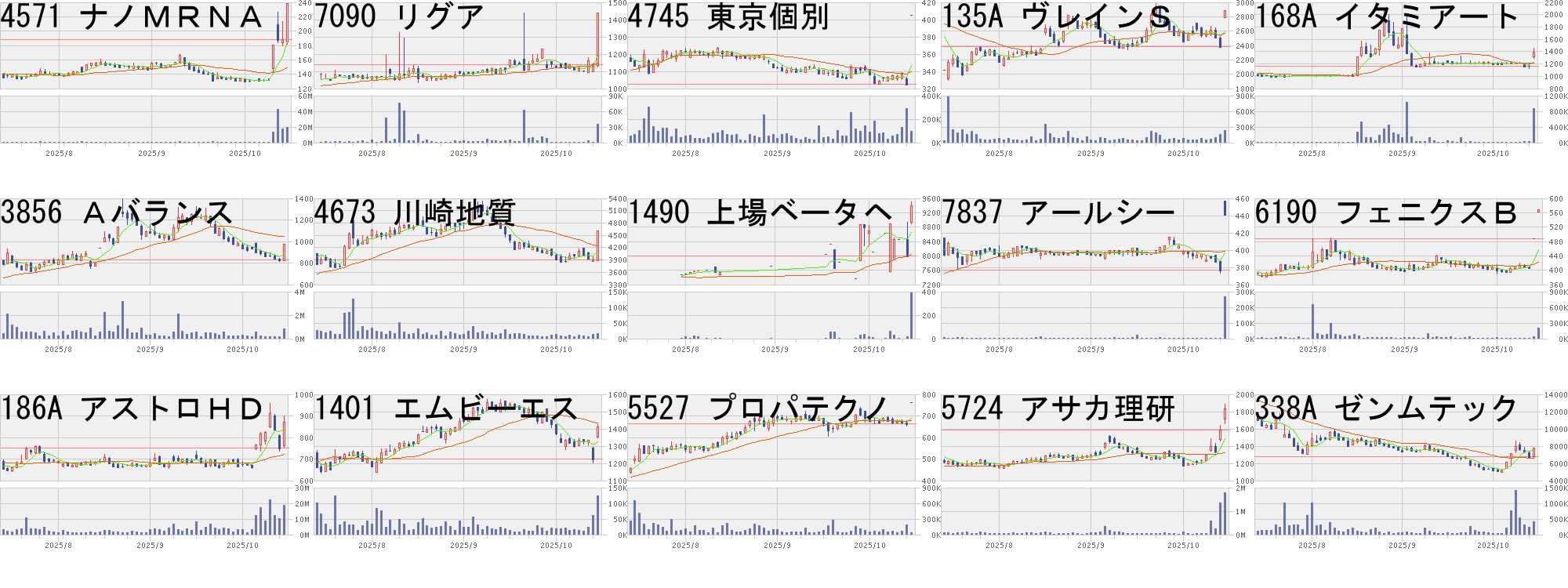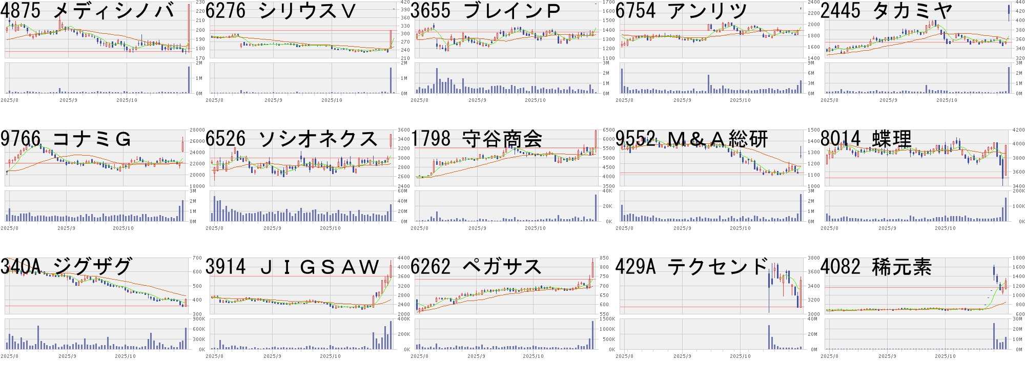 コード,銘柄名,市場,株価,前日比,前日比.1,出来高,PER,PBR,利回り4571,ナノMRNA,東G,238,50,+26.60%,19498300,-,6.49,-7090,リグア,東G,1438,300,+26.36%,36000,-,8.49,-4745,東京個別,東S,405,80,+24.62%,95800,22.0,2.56,1.48135A,ヴレインS,東G,2887,500,+20.95%,234200,48.4,19.84,-168A,イタミアート,東G,1394,233,+20.07%,870800,5.6,1.36,1.433856,Aバランス,東S,978,150,+18.12%,809100,6.2,0.64,-4673,川崎地質,東S,4600,700,+17.95%,16900,7.4,0.80,1.091490,上場ベータヘ,東E,9400,1400,+17.50%,390,-,-,-7837,アールシー,東S,441,64,+16.98%,269200,-,0.81,-6190,フェニクスB,東G,568,80,+16.39%,202800,14.4,1.70,-186A,アストロHD,東G,870,118,+15.69%,18612600,-,8.09,-1401,エムビーエス,東G,1411,188,+15.37%,123200,19.8,2.78,0.925527,プロパテクノ,東G,763,100,+15.08%,31800,9.4,1.17,3.285724,アサカ理研,東S,1829,239,+15.03%,1770000,41.8,1.92,0.44338A,ゼンムテック,東G,7800,1000,+14.71%,412000,66.7,16.62,-コード,銘柄名,市場,株価,前日比,前日比.1,出来高,PER,PBR,利回り8912,エリアクエス,東S,201.0,-80.0,-28.47%,1147600,22.4,2.32,1.493902,MDV,東P,447.0,-99.0,-18.13%,1324000,62.7,6.05,2.012334,イオレ,東G,3300.0,-700.0,-17.50%,764500,96.1,16.79,-7036,EMネットJ,東G,955.0,-193.0,-16.81%,172400,45.5,2.61,-4370,モビルス,東G,417.0,-80.0,-16.10%,17400,-,1.83,-3139,ラクトJ,東P,3420.0,-610.0,-15.14%,773600,7.8,1.13,3.862086,農中SP5H,東E,2735.5,-464.5,-14.52%,2440,-,-,-3370,フジタコーポ,東S,455.0,-76.0,-14.31%,1657200,12.9,12.96,0.662936,ベースフード,東G,369.0,-61.0,-14.19%,736500,-,19.38,-3935,エディア,東S,932.0,-148.0,-13.70%,1693000,16.2,3.98,1.18130A,ウェリタス,東G,577.0,-90.0,-13.49%,175300,-,1.85,-4429,リックソフト,東G,1025.0,-156.0,-13.21%,41300,14.6,1.47,-5246,エレメンツ,東G,816.0,-124.0,-13.19%,2716600,-,13.11,-4888,ステラファ,東G,311.0,-47.0,-13.13%,1182800,-,3.47,-3536,アクサスHD,東S,134.0,-19.0,-12.42%,2312300,16.3,1.85,1.49にほんブログ村