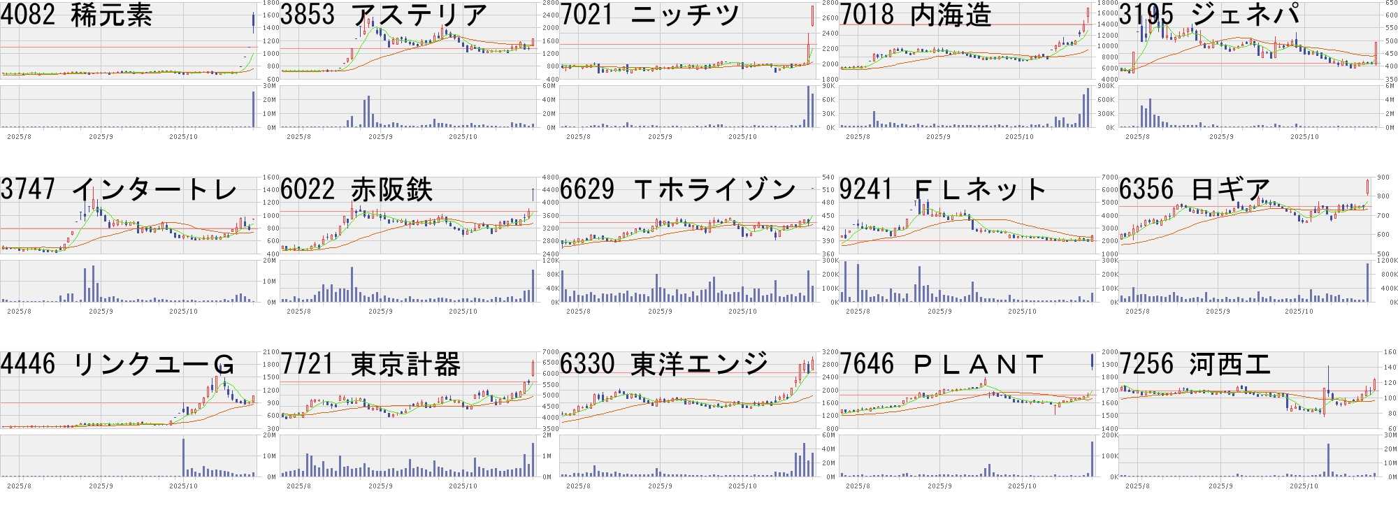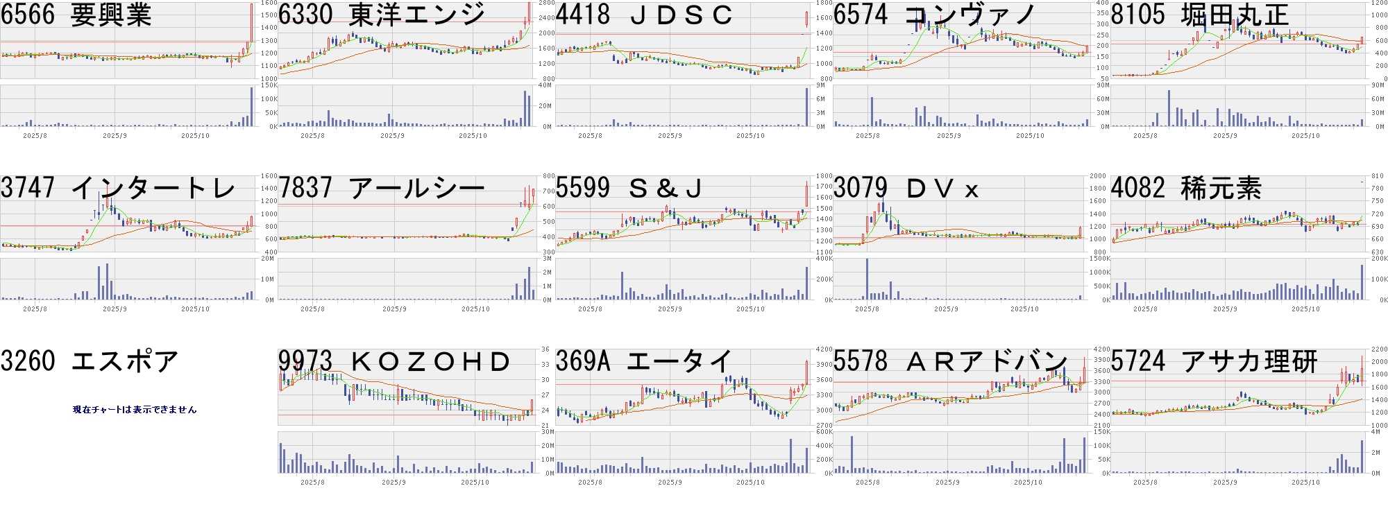 コード,銘柄名,市場,株価,前日比,前日比.1,出来高,PER,PBR,利回り6566,要興業,東S,1584,300,+23.36%,138400,16.3,1.29,-6330,東洋エンジ,東P,2787,500,+21.86%,29092800,32.7,2.37,0.904418,JDSC,東G,1665,284,+20.56%,8130300,62.1,6.23,-6574,コンヴァノ,東G,199,31,+18.45%,13722700,23.7,60.12,-8105,堀田丸正,東S,644,100,+18.38%,14379700,1215,13.97,-3747,インタートレ,東S,951,137,+16.83%,3788000,684,6.20,-7837,アールシー,東S,710,100,+16.39%,681000,-,1.30,-5599,S&J,東G,1699,234,+15.97%,310200,26.7,4.61,-3079,DVx,東S,1177,157,+15.39%,146400,31.3,1.44,4.254082,稀元素,東P,794,100,+14.41%,166000,128,0.51,3.533260,エスポア,名N,985,121,+14.08%,83600,-,-,-9973,KOZOHD,東S,26,3,+13.04%,7860400,-,18.44,-369A,エータイ,東G,3950,450,+12.86%,351400,29.4,5.29,1.375578,ARアドバン,東G,3680,415,+12.71%,125100,20.5,5.66,0.575724,アサカ理研,東S,1892,194,+11.43%,3076400,43.2,1.99,0.42コード,銘柄名,市場,株価,前日比,前日比.1,出来高,PER,PBR,利回り5952,アマテイ,東S,224,-42,-15.79%,2649300,18.3,1.79,2.239353,桜島埠,東S,3025,-550,-15.38%,752500,17.7,0.66,1.49168A,イタミアート,東G,1310,-217,-14.21%,196800,5.3,1.28,1.536190,フェニクスB,東G,611,-67,-9.88%,1965500,15.4,1.83,-2036,金先物Wブル,東EN,158700,-15850,-9.08%,78864,-,-,-2586,フルッタ,東G,252,-22,-8.03%,17250700,73.0,7.11,-5713,住友鉱,東P,4927,-373,-7.04%,6439400,21.9,0.74,2.663113,UNIVA,東S,81,-6,-6.90%,2500400,-,4.09,-1541,純プラ信託,東E,7877,-573,-6.78%,286111,-,-,-1540,純金信託,東E,20255,-1380,-6.38%,2270988,-,-,-4417,Gセキュリ,東G,3975,-260,-6.14%,282000,42.2,17.46,0.82299A,クラシル,東G,1442,-93,-6.06%,291800,26.4,5.45,-7035,アンファク,東S,234,-14,-5.65%,639800,-,2.97,-6590,芝浦,東P,16840,-1000,-5.61%,966900,29.4,4.77,1.194316,ビーマップ,東G,1152,-68,-5.57%,104200,134,11.77,-にほんブログ村