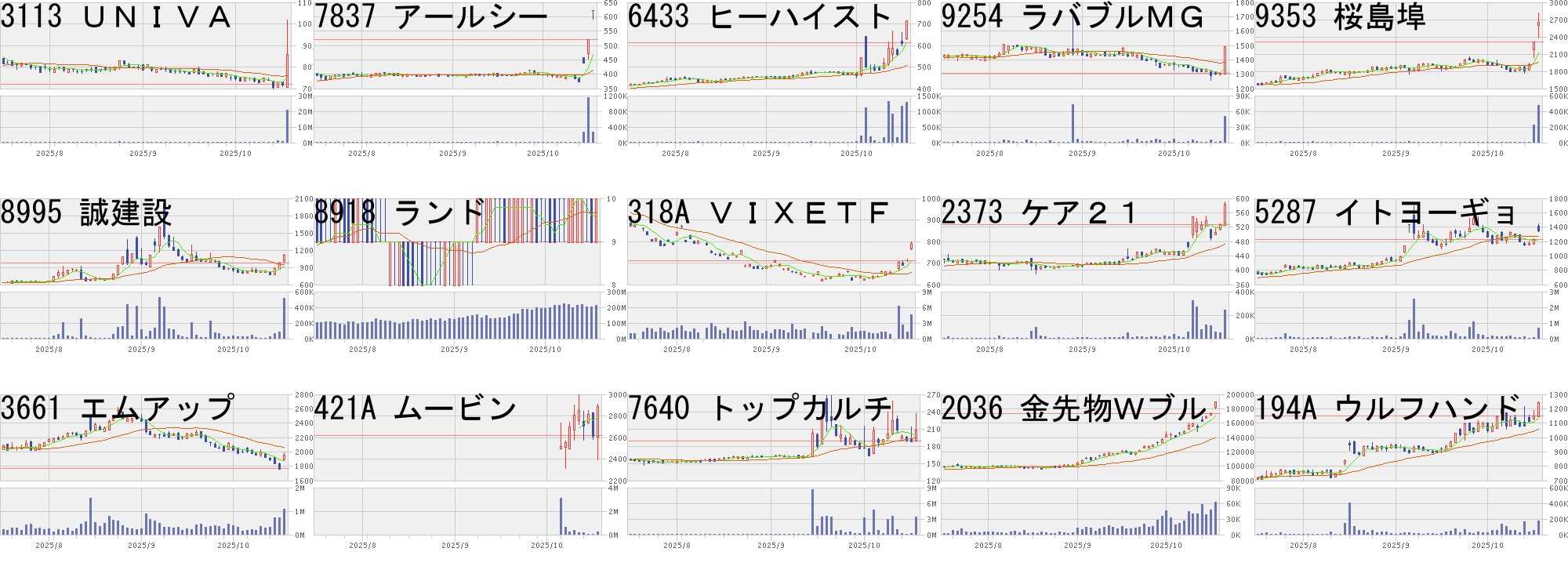 コード,銘柄名,市場,株価,前日比,前日比.1,出来高,PER,PBR,利回り3113,UNIVA,東S,86.0,14.0,+19.44%,20957400,-,4.34,-7837,アールシー,東S,621.0,100.0,+19.19%,272800,-,1.13,-6433,ヒーハイスト,東S,713.0,100.0,+16.31%,1295800,130,1.61,0.289254,ラバブルMG,東G,1494.0,189.0,+14.48%,50400,23.2,4.40,-9353,桜島埠,東S,2647.0,331.0,+14.29%,477500,18.3,0.58,1.518995,誠建設,東S,1111.0,131.0,+13.37%,518300,37.3,0.57,2.258918,ランド,東S,10.0,1.0,+11.11%,213739900,21.7,1.79,-318A,VIXETF,東E,790.3,78.3,+11.00%,4516630,-,-,-2373,ケア21,東S,584.0,57.0,+10.82%,243300,31.6,1.84,2.915287,イトヨーギョ,東S,1363.0,131.0,+10.63%,684400,17.4,1.10,1.323661,エムアップ,東P,1956.0,186.0,+10.51%,1090000,27.7,8.81,1.02421A,ムービン,東G,2886.0,266.0,+10.15%,232900,23.2,9.30,-7640,トップカルチ,東S,208.0,19.0,+10.05%,3372800,-,-,-2036,金先物Wブル,東EN,189500.0,15800.0,+9.10%,62255,-,-,-194A,ウルフハンド,東G,1242.0,92.0,+8.00%,178800,14.4,3.42,-コード,銘柄名,市場,株価,前日比,前日比.1,出来高,PER,PBR,利回り373A,リップス,東G,2075,-500,-19.42%,578800,10.8,1.46,-7090,リグア,東G,1140,-265,-18.86%,195000,-,6.73,-4446,リンクユーG,東P,1106,-203,-15.51%,2054700,50.9,6.05,-325A,テンシャル,東G,3765,-525,-12.24%,1834500,13.9,6.14,-5987,オーネックス,東S,2022,-277,-12.05%,6300,51.5,0.64,0.992315,CAICAD,東S,88,-12,-12.00%,13237900,14.7,4.99,-4068,ベイシス,東G,1581,-214,-11.92%,53400,23.0,1.44,-4571,ナノMRNA,東G,184,-24,-11.54%,4887100,-,5.01,-4889,レナ,東G,1850,-235,-11.27%,1031900,-,14.23,-5131,リンカーズ,東G,197,-24,-10.86%,692800,-,2.43,-423A,ライオン事務,東S,335,-39,-10.43%,4553900,12.9,0.88,1.494592,サンバイオ,東G,2690,-310,-10.33%,15099800,-,179.0,-6572,オープンG,東P,330,-36,-9.84%,488800,36.5,1.72,1.367318,セレンHD,東G,4840,-520,-9.70%,147600,20.2,2.8,-2334,イオレ,東G,2700,-289,-9.67%,632200,78.6,13.74,-にほんブログ村