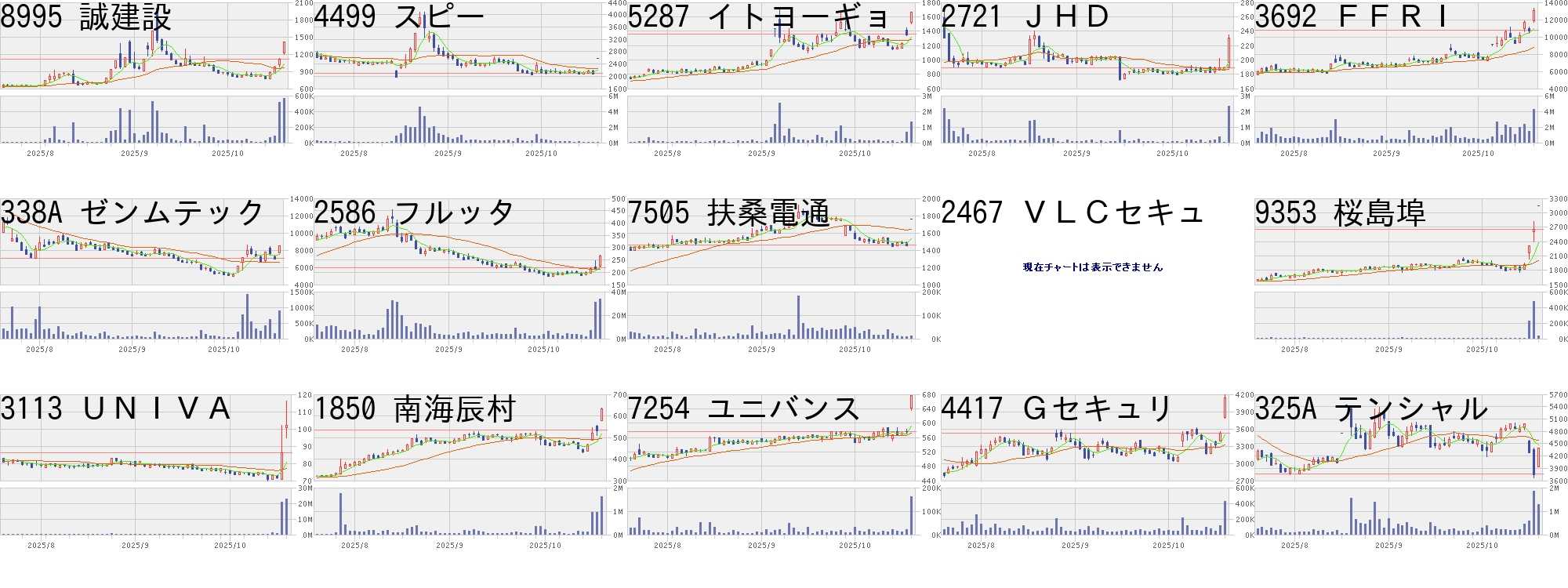コード,銘柄名,市場,株価,前日比,前日比.1,出来高,PER,PBR,利回り8995,誠建設,東S,1411,300,+27.00%,562300,47.3,0.72,1.774499,スピー,東S,2586,500,+23.97%,53800,-,3.83,-5287,イトヨーギョ,東S,1663,300,+22.01%,1304700,21.2,1.34,1.082721,JHD,東S,230,41,+21.69%,2323600,-,33.29,-3692,FFRI,東G,13070,2310,+21.47%,4266400,144,35.97,0.11338A,ゼンムテック,東G,8510,1500,+21.40%,885200,72.8,18.13,-2586,フルッタ,東G,265,46,+21.00%,33993200,72.8,7.08,-7505,扶桑電通,東S,1758,300,+20.58%,11300,8.1,1.45,4.952467,VLCセキュ,名N,250,40,+19.05%,991900,53.3,4.79,-9353,桜島埠,東S,3150,503,+19.00%,38000,18.4,0.69,1.433113,UNIVA,東S,102,16,+18.60%,22542300,-,5.15,-1850,南海辰村,東S,631,98,+18.39%,1613300,12.0,1.04,0.957254,ユニバンス,東S,676,100,+17.36%,160500,10.1,0.53,2.374417,Gセキュリ,東G,4135,605,+17.14%,429000,43.9,18.16,0.79325A,テンシャル,東G,4400,635,+16.87%,1283900,16.4,7.22,-コード,銘柄名,市場,株価,前日比,前日比.1,出来高,PER,PBR,利回り1676,WT貴金属,東E,41180.0,-8820.0,-17.64%,3240,-,-,-2338,クオンタムS,東S,630.0,-99.0,-13.58%,1362600,-,-,-7071,アンビスHD,東P,517.0,-80.0,-13.40%,4713600,14.0,1.42,0.771543,純パラ信託,東E,66040.0,-9940.0,-13.08%,8990,-,-,-1542,純銀信託,東E,24100.0,-3345.0,-12.19%,350602,-,-,-2036,金先物Wブル,東EN,166900.0,-22600.0,-11.93%,84966,-,-,-318A,VIXETF,東E,703.6,-86.7,-10.97%,2138650,-,-,-1673,WT銀,東E,7140.0,-859.0,-10.74%,88210,-,-,-4446,リンクユーG,東P,992.0,-114.0,-10.31%,1395000,45.7,5.43,-1541,純プラ信託,東E,9000.0,-1030.0,-10.27%,312048,-,-,-1675,WTパラジ,東E,19895.0,-2185.0,-9.90%,4925,-,-,-1674,WTプラチナ,東E,21575.0,-1855.0,-7.92%,16538,-,-,-4571,ナノMRNA,東G,170.0,-14.0,-7.61%,4448300,-,4.63,-1360,日経ベア2,東E,154.3,-11.5,-6.94%,95468690,-,-,-6190,フェニクスB,東G,578.0,-42.0,-6.77%,484700,14.6,1.73,-にほんブログ村