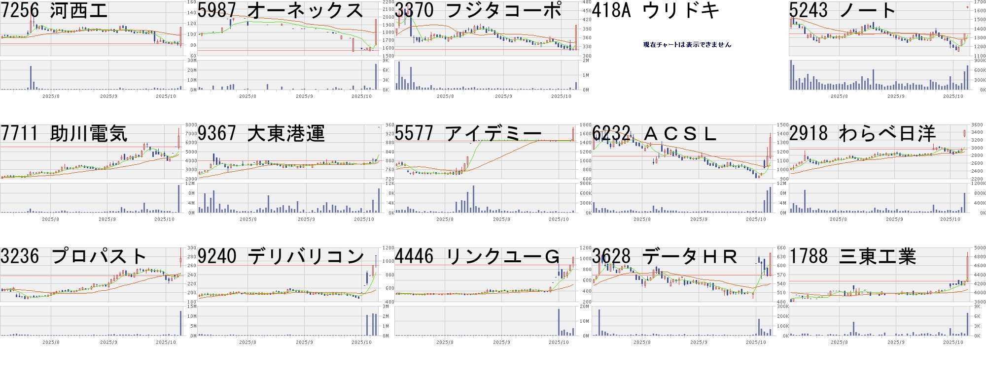 コード,銘柄名,市場,株価,前日比,前日比.1,出来高,PER,PBR,利回り7256,河西工,東S,112,30,+36.59%,3373400,-,0.35,-5987,オーネックス,東S,1966,400,+25.54%,7700,50.1,0.62,1.023370,フジタコーポ,東S,401,80,+24.92%,472400,11.4,11.42,0.75418A,ウリドキ,名N,1631,300,+22.54%,54000,19.6,15.94,-5243,ノート,東G,1644,300,+22.32%,733200,82.9,9.96,-7711,助川電気,東S,6700,1170,+21.16%,11123800,44.6,7.68,0.609367,大東港運,東S,949,150,+18.77%,9800,12.2,0.87,2.535577,アイデミー,東G,1700,261,+18.14%,48700,-,5.86,-6232,ACSL,東G,1356,207,+18.02%,10228800,-,52.74,-2918,わらべ日洋,東P,3460,503,+17.01%,790000,11.0,1.04,3.473236,プロパスト,東S,277,40,+16.88%,12345400,8.3,0.76,2.179240,デリバリコン,東G,1082,150,+16.09%,2169100,40.1,4.7,-4446,リンクユーG,東P,1015,135,+15.34%,4760800,46.7,5.56,-3628,データHR,東G,641,73,+12.85%,60400,12.9,84.79,-1788,三東工業,東S,4800,545,+12.81%,6900,12.0,0.88,1.46コード,銘柄名,市場,株価,前日比,前日比.1,出来高,PER,PBR,利回り2467,VLCセキュ,名N,176,-51,-22.47%,760800,37.5,3.37,-3905,データセク,東G,1640,-259,-13.64%,12736900,17.6,7.76,-3664,モブキャスト,東G,58,-9,-13.43%,10060800,-,7.39,-2962,テクニスコ,東S,372,-51,-12.06%,364500,113,2.1,-228A,オプロ,東G,2005,-265,-11.67%,49600,30.7,3.93,-3189,ANAPHD,東S,651,-82,-11.19%,616900,-,43.34,-4833,Defコン,東G,121,-14,-10.37%,25251200,-,10.67,-2370,メディネット,東G,35,-4,-10.26%,3298900,-,2.31,-5892,ユトリ,東G,3765,-395,-9.50%,351600,44.2,16.87,-3323,レカム,東S,105,-10,-8.70%,8341200,19.7,1.74,1.527063,バードマン,東G,211,-20,-8.66%,682400,-,19.61,-3719,AIストーム,東S,442,-40,-8.30%,1645400,100,7.36,-5075,アップコン,名N,1296,-114,-8.09%,30400,35.9,3.21,-2726,パルHD,東P,2173,-191,-8.08%,4338700,22.4,5.04,1.383350,メタプラ,東S,574,-50,-8.01%,57622200,-,3.25,-にほんブログ村