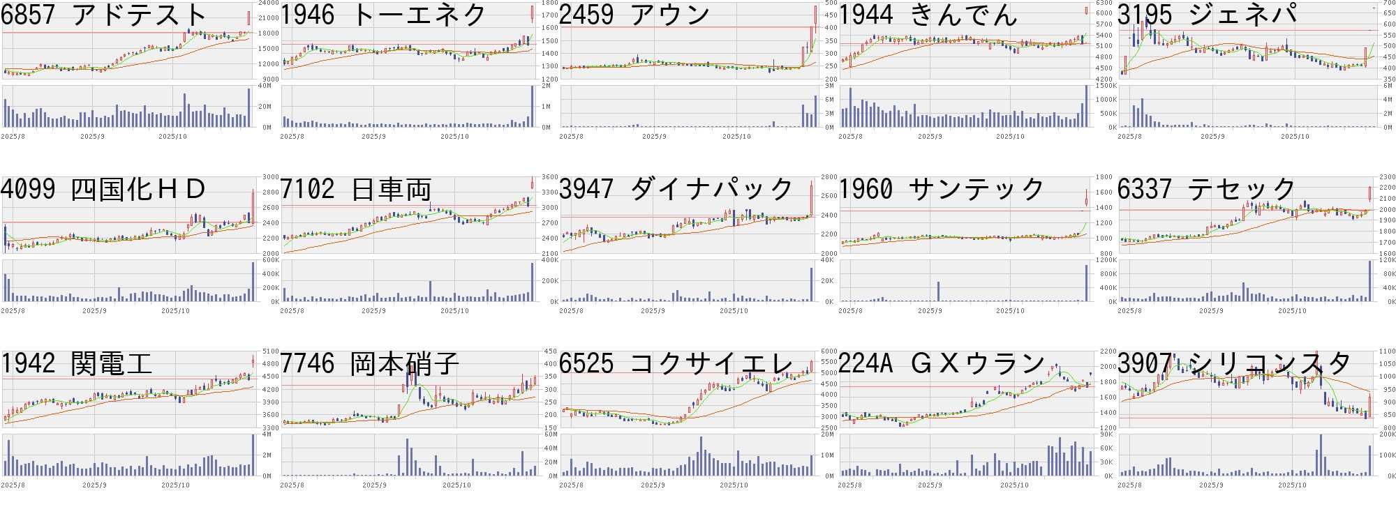 コード,銘柄名,市場,株価,前日比,前日比.1,出来高,PER,PBR,利回り6857,アドテスト,東P,22120,4000,+22.08%,36430400,58.5,26.35,-1946,トーエネク,東P,1771,300,+20.39%,1954500,11.0,1.17,3.672459,アウン,東S,484,80,+19.80%,6675900,-,11.75,-1944,きんでん,東P,6158,1000,+19.39%,1475800,18.9,1.98,1.953195,ジェネパ,東G,672,100,+17.48%,39300,36.4,3.00,-4099,四国化HD,東P,2773,366,+15.21%,558200,17.1,1.35,1.807102,日車両,東P,3480,445,+14.66%,363400,6.3,0.71,1.153947,ダイナパック,東S,2700,324,+13.64%,31500,9.3,0.60,2.961960,サンテック,東S,1506,159,+11.80%,1028800,14.5,0.78,2.666337,テセック,東S,2199,210,+10.56%,115400,50.8,0.84,4.551942,関電工,東P,4885,452,+10.20%,3866900,21.7,2.68,1.847746,岡本硝子,東S,346,32,+10.19%,13336100,501,5.66,-6525,コクサイエレ,東P,5514,505,+10.08%,9460900,35.8,6.47,0.65224A,GXウラン,東E,1903,173,+10.00%,51646,-,-,-3907,シリコンスタ,東G,919,81,+9.67%,142200,12.6,1.41,1.09コード,銘柄名,市場,株価,前日比,前日比.1,出来高,PER,PBR,利回り4479,マクアケ,東G,732.0,-278.0,-27.52%,1055100,26.3,1.74,-9742,アイネス,東P,1671.0,-289.0,-14.74%,398900,34.8,0.91,3.294960,ケミプロ,東S,348.0,-60.0,-14.71%,543700,22.4,1.18,1.444498,サイバトラス,東G,1261.0,-197.0,-13.51%,952400,21.3,3.04,0.913865,北越コーポ,東P,836.0,-127.0,-13.19%,1015300,23.4,0.54,3.114082,稀元素,東P,1122.0,-167.0,-12.96%,6158600,181,0.72,2.503853,アステリア,東P,1394.0,-206.0,-12.88%,4006900,-,3.72,0.612175,エスエムエス,東P,1310.0,-191.5,-12.75%,1739800,15.3,2.46,-5532,リアルゲイト,東G,2944.0,-386.0,-11.59%,620600,23.3,5.12,-7093,アディッシュ,東G,644.0,-83.0,-11.42%,581700,27.1,3.14,-3664,モブキャスト,東G,55.0,-7.0,-11.29%,12374400,-,7.01,-6330,東洋エンジ,東P,2460.0,-306.0,-11.06%,23204500,28.8,2.09,1.027711,助川電気,東S,7400.0,-920.0,-11.06%,793300,49.2,8.48,0.542389,デジタルHD,東P,2100.0,-255.0,-10.83%,613300,17.1,1.33,1.102962,テクニスコ,東S,466.0,-56.0,-10.73%,3257000,142,2.63,-にほんブログ村