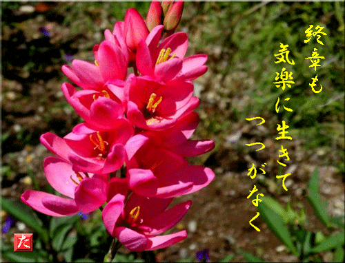 今日の川柳“ 終章も気楽に生きてつつがなく”とは言っても長生きしすぎてしまったかもと思うこの頃。気楽に生きているのは確かだけど、「恙無い(つつがない)」と言うとそうではないかも・・・。体力、知力も衰え、思いがけない悲しみも味わうことになる。秋の花さあ~、愚痴は言うまい!今日も明るく元気にいこう! にほんブログ村いつも応援ありがとうございます。今日もポチッとよろしくお願いします。