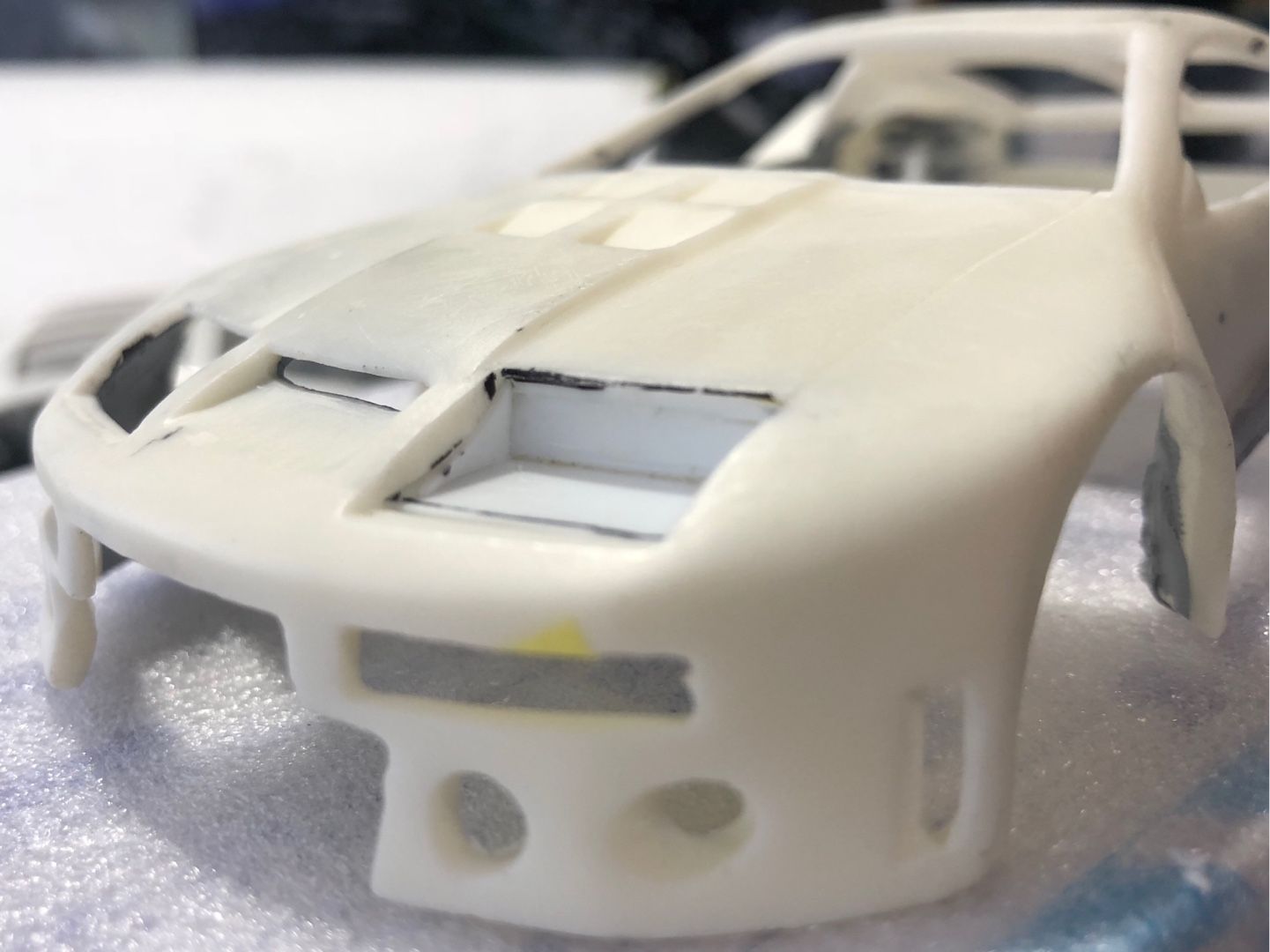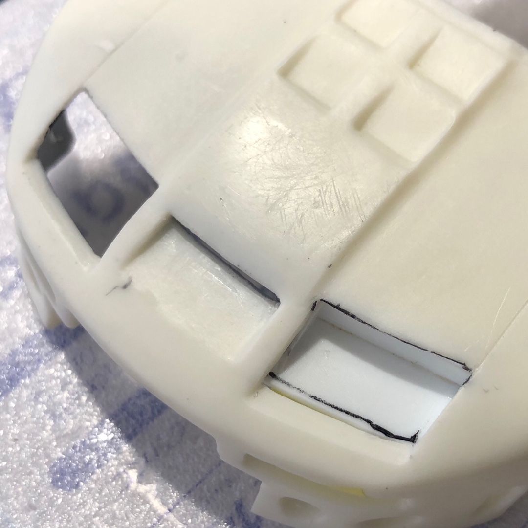 マスキングゾルで表面張力を使ったマスキングをして、良い感じに縁にだけパテを乗せる作戦だったのですが、これ(写真右)では端っこまでマスキングがされているので、パテが乗るところがありません。やり直しです。