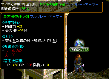 サブの魂炎で友達を藪ドーナツに送ってきました。そして暇だったのでガー君とタイマンしてきました。殴られBIS(ダメ返し)でがんばったbステは↑これ。がんばって20分程度で倒しました。経験地は60でしたorz倒したときのSSとっとけばよかったなあ・・・あと今日のGv。15レベル↑くらいの敵に防具破壊指装備したら白ダメ30がいきなり80に上昇した。これにはびっくり。ま、倒せなかったけどね('A`)