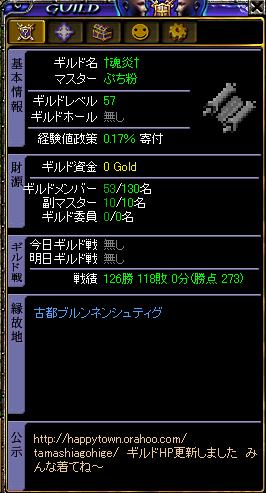 どーもこんにちはあごひげです毎日更新を目標にしていましたがいつの間にか月1日記になってたorzそしてRS。運狼224歳→純メテオWIZ234歳になりました。再振りは大変ですねえ・・・所持金6Mから装備を売って40Mにはできましたがかなり紙・・・そんなこんなで神殿B4で狩りをしているとなんとHP効率93%のフルプレが出ました!んで露天で1億で即売りそしてギルメンからアイテムを買い装備を高めていきましたん~残念ながらSS今回1枚もとってなかった・・・けどステはたしかHP1900 防御120だったかな・・・まあいいや今度SSうpしよっと!あ あと†魂炎†は火力200↑募集してます!BIS WIZいるけど火力がない。。。まあがんばりまうb