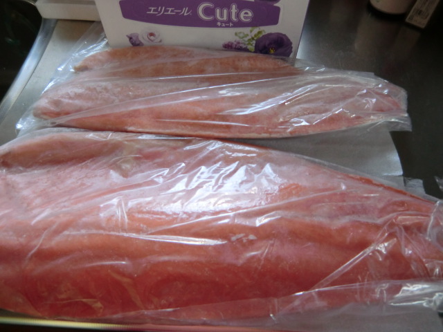購入店舗 サーモン専門店岩松商品名 刺身用トロサーモン【まるごと半身 約1キロ】 価格2300円 写真手前 訳ありトロサーモン【半身約700g】 価格1000円 写真奥とにかく大きく、脂のりが良い。さすが、サーモン専門店だけあって、品質良しこの価格だったら、おしみなく食べられる。ちなみにスーパーで買おうとしたら、100g辺り350円前後していた。(スーパー2店舗でチェック)一キロのトロサーモンが2300円なので、100g辺り 230円 かなり安いが、実際はもっと安いと言うのは届いたトロサーモンを量ってみたところ1.3kgあった。と言うことは、実質 100g辺り 177円訳ありトロサーモンだったら 100g辺り 143円生でももちろん食べられるが、炙り焼きにしてみた。焼いたら、脂がじゅわっと出てきた。外側を焼き、中は生のままでいただく。山葵醤油でも合うが、玉ねぎの薄切りスライスを水でさらしたものと一緒にいただくとまた格別だ。「サーモンには、抗酸化力で女性に関心の高い栄養素、『アスタキサンチン』も豊富です。おいしくて、美容にもいいサーモンをぜひご賞味下さい。」と、ショップの商品案内に書かれていた。 老化防止に役立つ、サーモンたくさん食べていつまでも若々しく!!
