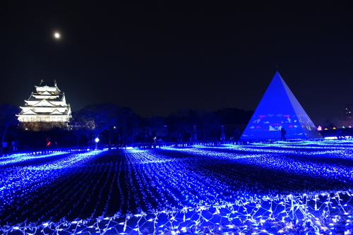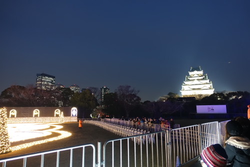 まんまるお月様が大阪城の上に出ていました。プレミアムチケット専用鑑賞スタンド 最上段より見た眺めです。専用鑑賞スタンドは、大阪城3Dマッピング上映終了後、入れ替え制のため、光のビッグブルーについては、短時間の録画しかできません、4秒だけの録画ですが雰囲気だけどうぞ広大な光の海が波打つ「光のビッグブルー」の奥に、日本最大、高さ23mの「マッピングon the ピラミッドツリー」が見えます大阪城スーパーイルミネーション光のビッグブルーとライトアップされ夜空に浮かび上がる白い大阪城そして、日本最大、高さ23mのマッピング on the ピラミッドツリープレミアムチケット専用カフェより撮影大阪城スーパーイルミネーションは、3月1日まで開催中だんだん日が伸びるので、日帰りの方は、お早目の来場がお勧めです入場料はレギュラー 1,700円 プレミアム 3,100円 レギュラーとプレミアムの違いは、見えやすさ プレミアムチケット専用鑑賞スタンド と プレミアムチケット専用カフェから 座ってゆっくり眺められますプレミアムチケット専用カフェは、ストーブもところどころに置かれていて暖がとれます。入場者が多い場合は、プレミアムチケット専用カフェよりプレミアムチケット専用鑑賞スタンドから見るのがオススメ 大阪城3Dマッピングも動画撮ってきました。後日アップいたします。