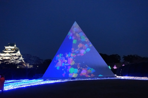 大阪城スーパーイルミネーション続いてますが今日は大阪城マッピング on the ピラミッドツリー です。日本最大、高さ23mもの高さがあります。ピラミッドにまつわる物語を2面の3Dマッピングで表現しています。