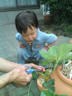 妻です。 旦那の育てているいちごプランターに小さなイチゴが二つ実りました。 じいじと一緒に収穫。 「早く採ってくだしゃい!」 そして、即食す(笑)。 「おいちいね~♪」と、少量ながらも満足な様子。 早く次のが実るといいね(≧∇≦)