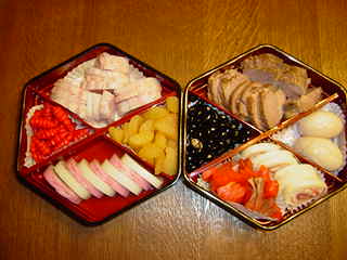 大急ぎで仕事から帰宅。明日も仕事なので、今日中におせち料理を重箱に詰めなきゃ~。昨日のうちにある程度(切ったりとかね)しておいたから、すぐに出来たよ~。でもね、作ったのは煮豚&煮玉子だけなんだけど・・・ では左上からロースハム 長呂儀 数の子 紅白かまぼこ右上から煮豚 黒豆 煮玉子 スモークサーモン モツァレラチーズの生ハム巻きです。体調はまあまあ。明日もお仕事頑張るよ。ブログを見てくれている方、いつも温かいコメントをくれるみなさん、1年間\(∇⌒\)☆ア☆リ☆ガ☆ト☆ウ☆(/⌒∇)/来年もよろしくお願いします。(゜゜)(。。)ペコリ今日のお薬 メリスロンx2