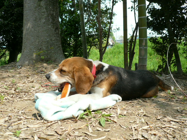 またまた連休の一日目。午前中は裏の竹やぶの草取り。ついでに筍も掘った。お手伝いに来た。 邪魔ばかりするので歯磨きタイム。毛布は自分で持ってきました。無農薬の草なので、食べてお手伝いはしてたけど・・・休憩も一緒。ママのお茶を少しもらって飲んでおやつタイム。(太郎はお茶が好きなのです。) お口にコング入ってるからすごい顔。鼻に葉っぱついてるし。 コレは超便利。丈夫だし、時間稼ぎ出来るしね。最近休みの日は昼メロ見て3時ごろまで昼寝してる。体がだるくてしょうがない。夜も寝るの早い。やっぱり調子良くないのかな。今日のお薬 メリスロンx3
