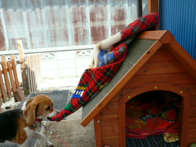 午前中何度も洗濯機をまわしたせいか発作が起こり、(@@)?? メガマワッタ午後のお散歩までには全快。お散歩の後、太郎の家周りの草取りした。取り始めは太郎もそばで遊んでたけど、取り進んで行くうちに私の後姿しか見えない太郎。ガサゴソ聞こえるので振り向いたら ゛(・・ ンッ?太郎の宝物の毛布がおいてある毛布で遊んでたのかなぁと思っているとまたもガサゴソ聞こえてきた。 今度は大好きなおもちゃがおいてある一緒に遊びたくて宝物をねぇちゃんにくれようとしてたのね~。すっごく嬉しくて、可愛くて、おりこうさんで涙が出そうになったよ。毛布<私のランクなのね、太郎。