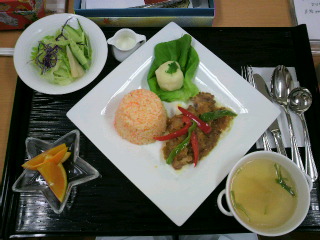 夜中に激しい頭痛で起きて吐き気もひどく、吐いちゃった・・・吐き気が治まってから頭痛薬飲んでまた寝たら風邪も気分も良くなってました。明日休みなので病院に行こうと思っていたのですがこれなら大丈夫そうです。ご心配をおかけしてm(;∇;)m ゴメンネまだ不安な所も、失敗もあるけれど1人で出来る事が多くなりました。今月の目標も勝手に作って頑張ってます。今日のお昼は初めて食堂に頼みました。1食¥450はちょっと痛いけど~。 メインは鶏肉の梅ソテー。ご飯は人参ご飯です。今日も早寝します。お返事、もう少し待ってね。