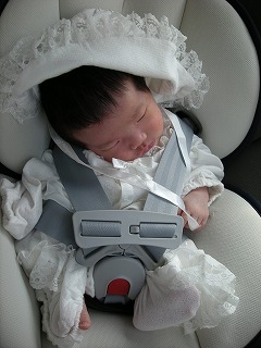 お久しぶりのMrs.Tannyです体調も戻りやっとPCに向かう時間ができてきた今日はlittle Tannyのお宮参り初の外出&行事&猛暑で少々心配だったが午前中の早い時間からスタートとスケジュールをたてるもののやはりbabyはそんなに甘くない。。出るときに限っておなかがすいたり泣いたり早めのスタートのはずが・・・ま、なんとか出発しおめかししてチャイルドシートにうまいこと乗せられたもののちょっと苦しそう 「なんかぬいぐるみみた~い」とホレボレするMrs.Tannyに「はずしたらええやん!」と冷静なMr.Tannyとまあ、無事近所の神社でお参りを済ませ今度は実家のほうでお礼参り。これにはlittle TannyよりもMr.のほうが疲れてしまったよう暑い中大変お疲れ様でしたベビ子よ、すくすく育て