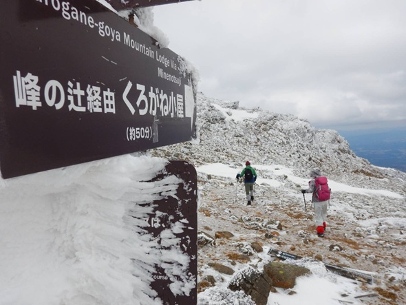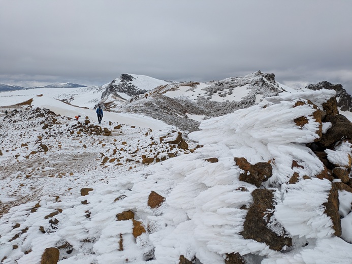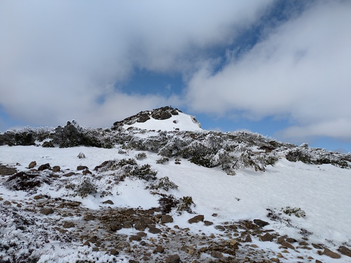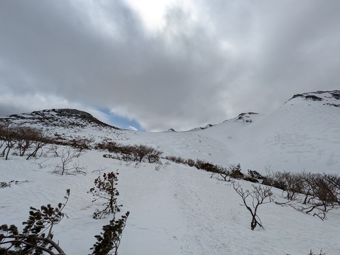 ところどころ土が顔を出して、ハイマツは雪まみれ。
