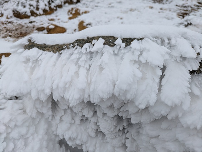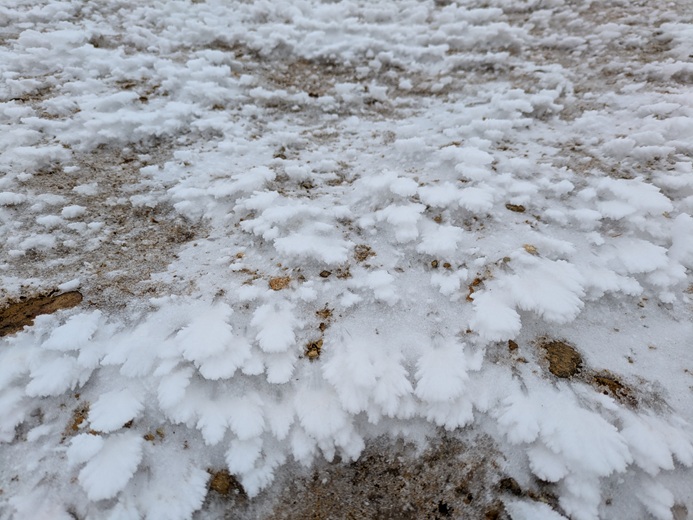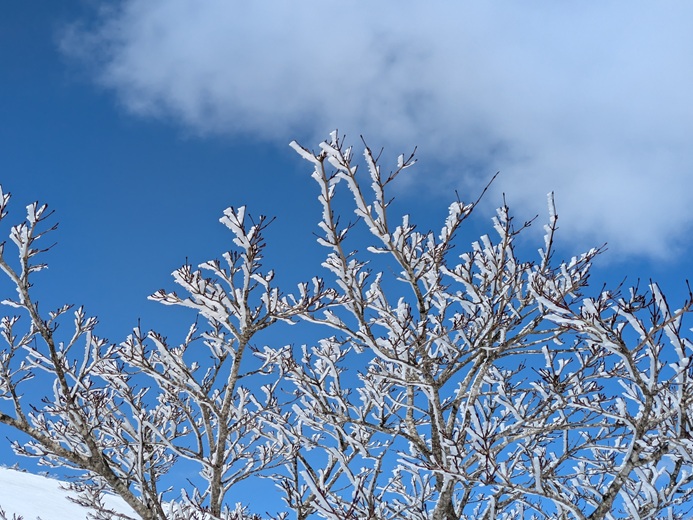 なだらかで歩きやすい道になり、見上げると木々が白い。
