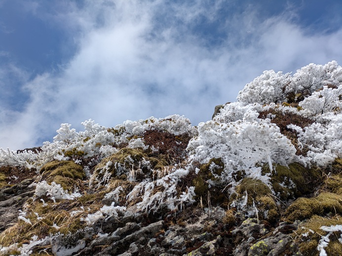 凍てつくハイマツの向こうに山頂が近づいてきた。