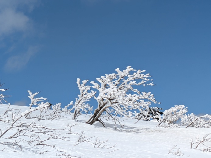 少し傾斜のある広い雪原に雪を纏った木々が点在していて