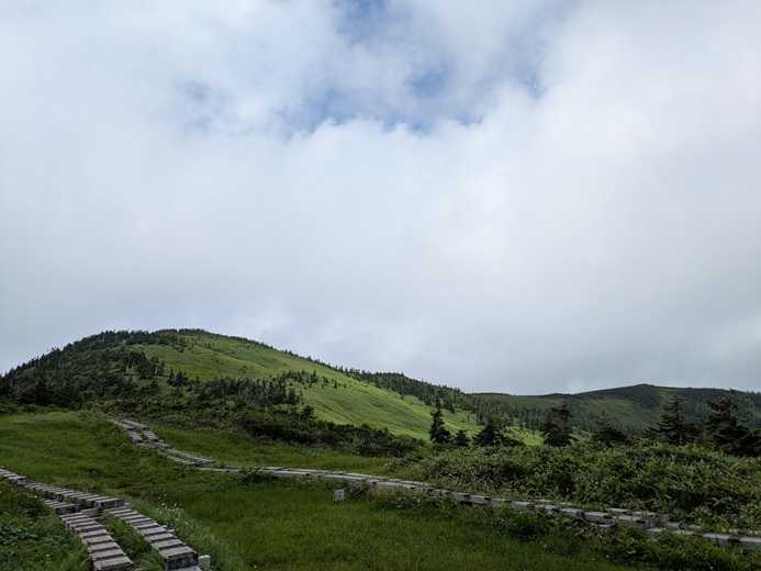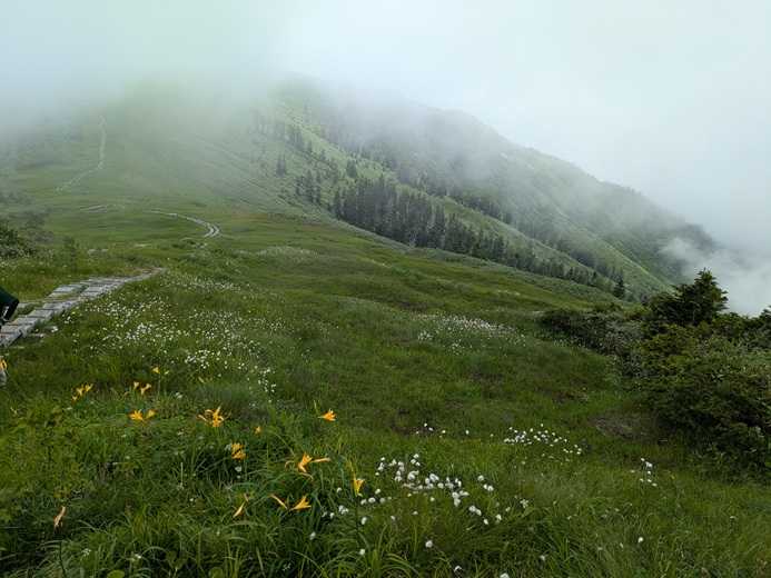 曇り空で時々ガスも湧き、山頂方向が見えたり隠れたり。