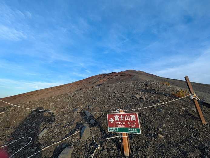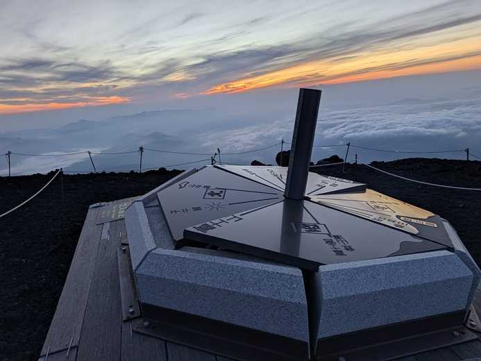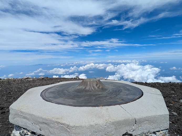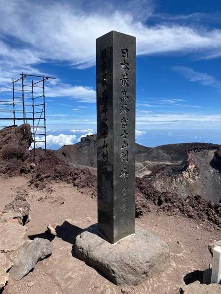 日本最高峰富士山剣ヶ峰の標識の前で記念撮影をした。