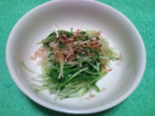 夕べテレビで見たレシピを参考に作ってみました。茹でないみず菜のおひたしです。ポイント:おひたしだけどお湯で茹でない。作り方・みず菜を適当な長さに切り、太いほうを上にしてざるに入れる。・沸騰させたお湯を60秒ほどかけてゆっくり回しかける。・粗熱をとったら小皿に盛り付け削り節、醤油で味を調える。みず菜のしゃきしゃきした食感がそのまま残ったおひたしになります。