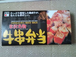 今日は母の誕生日、朝早くにおきて実家に向かう。今日は日帰りで親孝行の真似事でもしよう。家に帰ってまずプレゼントを渡す。そして待っていたように家事を頼まれる。まずは鋼鉄製の物置棚の移動、これが重い。ついでお買い物、買い物リストもできている。なにせスーパーが遠くなったんだよねぇ。そして偶然にも買い物に行ったスーパーで駅弁・空弁フェアをやっていた。そこで思わず昼食用に買ってしまった駅弁がこちら表中身米沢名物牛串弁当、1100円。米沢牛のロースを少し大きめに切り、竹串に刺して調理してある。そしてごぼう、山菜、漬物が添えられている。すっかり冷えてしまっているけど肉の味付けはしっかりしている。肉は厚めに切ってあるので食感もいい。しかし全体に量が少ない。これでは2,3個食べないと満腹感は得られないなぁ。男の人にはオードブル感覚であろうか。また付け合せももう一工夫、山形らしい野菜に変えるなどしてほしい。ゼリー寄せおでんは食べられなかったので、今度食べたらレポします。そしていつの間にか夕方になり、戸締りをして戻ってきたのでした。親孝行になったかな?