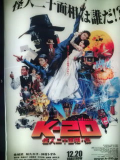 当初予定にはなかったのですが、映画館の前を通ったらなんとなくチケットを買ってしまっていました。それがK-20 怪人二十面相・伝さて、そのK-20ですが、結論から言えば、おもしろい仮想世界の東京を舞台にサーカスのスター金城武が怪人二十面相を捜し求め、対決するという物語、原作にない演出や適度なスピード感があります。主演の金城武、松たかこ、仲村トオルをはじめとした出演者がそれぞれ好演しています。エンディングは凡庸ともいえますが、単純に楽しめる作品に仕上がっています。本編の流れとは関係ありませんが松重豊さんの演技が面白い。それから木野花さんが出演していますが、最近よく映画でお見かけしますね。