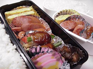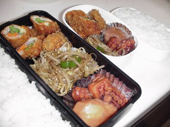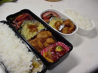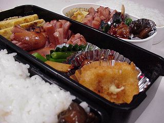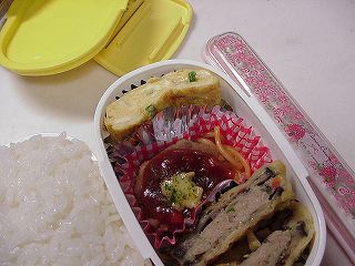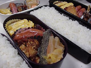 メニュー* 卵焼き* ウインナー炒め* 石狩鍋(昨夜の残り)* やきとり(冷凍)* から揚げ(冷凍) 昨日、主人が会社近くでお好み焼きを食べて来たとかで、夕食をあまり食べなかった。で、鮭を5切も入れた「石狩鍋」が大量に余ってしまった。そこで、お弁当に入れてみたのだ。冷た~い石狩鍋、おいしいかなあ?みんなの感想が楽しみ&不安!