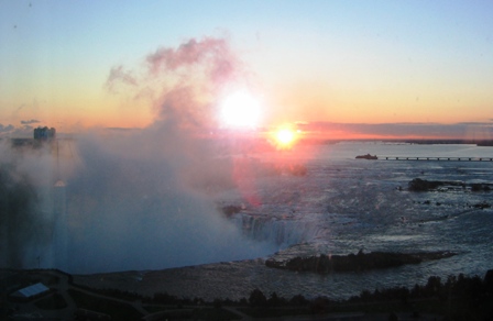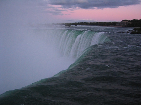 今日からカナダです。乗り継ぎがイマイチでデトロイト経由だったこともありナイアガラに着いたらもう夕方でした。空港からナイアガラまでは車で約1時間。いきなり爆睡して気がついたらナイアガラ着です。そこでいきなりの滝の登場です。おおおお…「凄い!」思わず出た言葉。水爆とはこのことです。スケールのでかさにその後無言の時間が続く…宿泊するホテル群です。CASINOがあるだけあって結構綺麗でした。夕暮れのカナダ滝です。水が落下する勢いで水しぶきがこんなに高いところまで登っています!!疲れたので晩御飯はホテルの中のレストランで食べました。スタミナ回復のために??ステーキ食べてます!これがまた「JUICY!」ステーキ頬張る私!!調子こいてワイン飲んで語り始める私!「その上の頂」の話を始めたり…すっかり良い気分になった私はそのままホテルで爆睡です。明日はナイアガラ周辺の1日観光です!