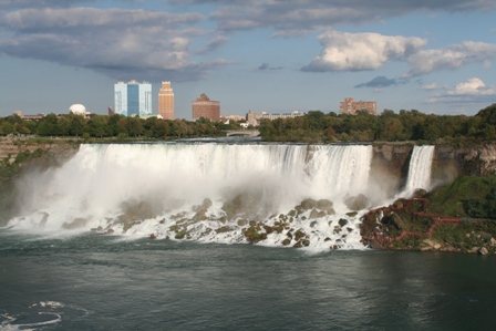 さあ、1日観光です。朝ごはんを食べようかと外を見ると、おお!いきなり凄い景色!!綺麗な朝焼けです。そしてあっと言う間に太陽が登り… 良い感じです。しかしでかいなー。観光には同じくらいの年齢の女性のガイドさんが着きました。キャリアウーマン!って感じです。荒川静香っぽい感じ…聞いた所によると夜には水門をコントロールして水量を減らすようです。そうしないとカナダ滝は毎年1mも滝壺が侵食してしまうとの事。とは言え朝からすんごい量の水が流れてますけど…これから「霧の乙女号」で滝に接近です。乗船場で並んでます。さあ、出発です。アメリカ滝が目の前に…更に接近!水って生きてる?って感じがしました。(なんか表現変が?)みんな青いカッパ着て盛り上がってます!!びしょ濡れなのに…カナダ滝に接近!!!うおおおおお!!洪水!!前が見えません!!滝から見たタワーです。しかし空が青い!!スケールのでかさを感じた瞬間でした。