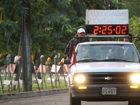今はワイキキからインターネットしてます‥ホノルルマラソンが終わった。今回は過日に書いた通り、足の負傷のため応援に回ることにした。はっきり言って気持ちの整理ができぬまま同行メンバーの韋駄天倶楽部のサポートに回った。朝2時起床。(日本時間日曜の夜9時)3時半出発。5時START。スタート後、5マイル地点まで先回りしてメンバーを待つ。5時40分頃、長谷川理恵さんが通過。いつ見ても美しい。そういえば昨日ナイキタウンでセミナーしていた。それから遅れること数分後同期のK君が通過、そして他のメンバーが続々と通過していく。今回初マラソンのMちゃん(うちの会社のアルバイトなんかをしている学生)が48分(6分/km)のペースで通過。少し驚いたが、このペースではオーバーペースであろう。全員を見送った後、やることがないのでカラカウア通り沿いのコーヒーショップでコーヒーを飲んだ。普段からこんな朝早くやっているのか?マラソンだから特別なのか?よくわからないが客は自分ひとりで店員の女性が暇だったらしく自分に話し掛けてくる。店員;なぜあなたは走らないのですか?俺;足を怪我しているのです。店員;このあとどうするの?俺;ゴール地点で友人たちを待ちます。店員;お友達は何人?そんなに早い人たちばかりなの?今6時だよ?俺;‥‥俺;朝食をとりながらのんびりとしていますよ。なあんて会話をしながら暇つぶし。窓の外からはランナーの姿が見える。それもほとんど日本人。そうこうしてるうちに、6時半過ぎたのでゴールのあるカピオラに公園へ向かう。あと30分するとトップランナーがゴールする。滅多に無い事なんで見てみることに。7時過ぎ(15分くらいだったかな)、褐色の黒人ランナーがゴール。全身バネのような走りで通過していく。改めて思った。「速く、長く、走れることって地味だけど物凄いかっこいい」人は見かけやツール(道具)にこだわって日々生きているけど、やっぱり切磋琢磨して自らを鍛え上げることは大事だと思ったし、素晴らしい。アスリートには見習うものも多い。さて、話を戻しレースの進捗。2時間25分過ぎ(ハワイ時間7時25分)、大和撫子のエース「早川恵理(字間違ってるかも)」さんが通過。「細い、小さい」が第一印象。しかし何度見ても大きな歩幅で駆け抜けていく。どこにあのパワーがあるのか‥まだ2時間台だとゴールする人たちも少ない。韋駄天のメンバーは30km付近だろうか?予想では同期のK君が3時間45分前後にくるだろう。なので後1時間程度待つことになる。しかし3時間15分あたりには長谷川理恵さんがゴールするだろうからカメラでも構えて待ってようか‥実際には25分頃に通過した。しつこいようだが何度見ても美しい。同期のKくんがもう間もなく登場。(のはず)オレンジ色のユニフォームを探す。今回アミノバリューランニングチームとかなり似ている。向こうは数百人単位で参加しておりはっきり言って探すのは疲れた‥Kくんが予定時間になっても来ない(8時47分)どうした?もう過ぎてしまったのか?いやそんなはずはない。と思ったら姿発見。SUB4(4時間切り)ぎりぎりって感じ。でも凄いことだ。キスデジタルで連写。雄姿が撮れたと思う。言うまでもないがもちろん長谷川理恵さんも連写している。他のメンバーはどうか?なかなか来ない。事前の申告タイムは過ぎている。トラブルか?K君が通過後、約20分後に一人それからさらに20分後もう一人が通過。苦しそうだ。二人とも歩く&立ち止まったりしている。相当量のトレーニングを積んだと聞いていた。しかしこれがマラソンというものだ。練習量は裏切らないが本番での勝負とは厳しい。気候、体調管理などなど‥そもそも本番前日入りってのが無理か?もっと早くホノルル入り出来ないのか?もう1日早ければ体調はずいぶん違うだろう。文章がだいぶ長くなったのでその他はサマリーで。先ほどのアルバイトMちゃんは5時間30分くらいでゴール。愛嬌のある笑顔で通過したがやはりオーバーペースで30km過ぎ失速したようだ。まあ初めてならこんなもんだろう。ちなみにゴールの後TBSのビデオクルーに取材を受けていたのでTBSに映るかもしれない。それは来年1月のホノルルマラソン特番か?もしくはNEWS23か?NEWS23の久保田アナウンサーまた参加してました。タイムは更新したようです。(本人談)久保田アナ、キュートでした‥さてその他のメンバーは5時間台ぎりぎりと6時間半くらいでゴール。上出来かと。人のことばかり書きましたがここからは私のホノルルマラソンを書きます。「宣言書」1.来年は怪我を治して、そして肉体改造してスタートラインに必ず立ちます。2.自己ベスト、いやSUB4を狙えるように絞り込みます。(何もしなくてもスポーツクラブで汗を流す程度で4時間30分は出せる体力はあると思っています。しかしもう30分を縮めるためにトレーニングを。)3.体重を5kg落とします。(入社当初のスリムな体に)今年は仕事でも新製品のブランドコンセプトとして3つの宣言をしました。ホノマラでも