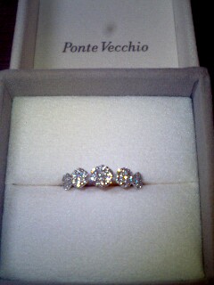 昨年のクリスマス、クリスマスプレゼントを買ってくれるというボスに、「まだ欲しいものないわ~」と言うとくれた、プレゼント予約券期限ギリギリまで粘って、昨日、使わせてもらいましたCHANELの財布と接戦で決めたのはこれポンテベッキオという宝石屋さんで、ダイヤのピンキーリングを買ってもらいましたピンキーリングは指が長くないと似合わないって思ってたんですが、これはすごくかわいいデザインで、一目見て気に入りましたでも・・・・、並んでいるピンキーリングの中では、一番高いお小遣いを渡してもいないのに、こんな高価なリングを買ってもらっていいものだろうか天使の私と悪魔の私が、戦っていましたボスに、「どうしよ~、○万円もするよ~」と言うと、「いいやん!アクセサリーは安いものじゃなくて、自分が気に入ったもの選ばなあかんで」な~んて、男前なことを言ってくれたので、お言葉に甘えちゃいましたこれは、クリスマスプレゼントと、私の4月の誕生日と、ホワイトデーをくっつけたプレゼントになりそうです清水の舞台から飛び降りる気持ちで買ってくれたんだろうな~、ありがとう本日はノロケの日記でした