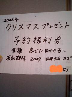 昨日はクリスマス・イヴ結婚1周年を迎えたばかりですが、特にステキなレストランで食事がしたいとかいう願望はなく、普通の休日を過ごしました。ボスは朝から学校へ行き、帰ったらクリスマスプレゼントを買いに連れて行ってくれるということ、さて何を買ってもらおうか・・・カバンもいいし、指輪もほしいな~とか色々考えていると結局ボスが帰ってきて、「欲しいのがなかったら、今日にこだわらず、いつでもいいで~」と言って、こんなものをくれました。私の誕生日が4月6日なので、有効期限は4月5日までゆっくり考えましょう~せっかくのクリスマスだということで、クリスマスケーキを焼くことにしましたいちごも買って、準備万端、まではよかったのですが・・・・膨らみません!!ホットケーキミックスを使ったのにもかかわらず、膨らみません!!タルト生地のように硬くなってしまったケーキを無理矢理デコレーションしてこんな感じ・・・ナイフがないと食べれない硬さ、でございましたそして、関西人なら誰もが楽しみにしている年末恒例「M1グランプリ」を鑑賞今回も納得の結果のような気がしますさ~て、今日はいい天気だから洗濯物が乾いて気持ちいい1日になりそうです