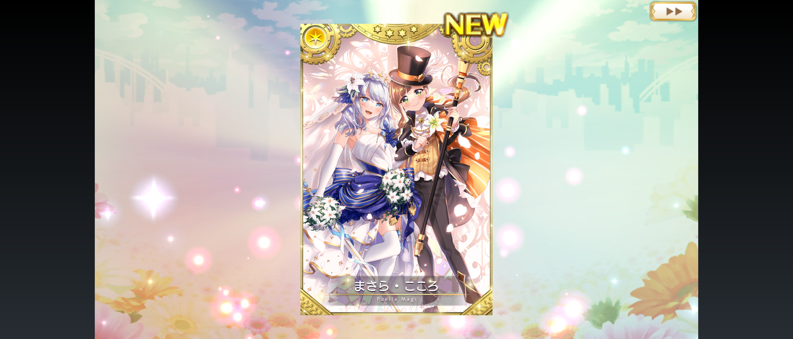 マギアレコードの新イベントで実装されたまさら・こころカップルの百合ユニット。ウエディング衣装での撮影モデルに選ばれたということで始まったイベントですが、なかなか良きですね。