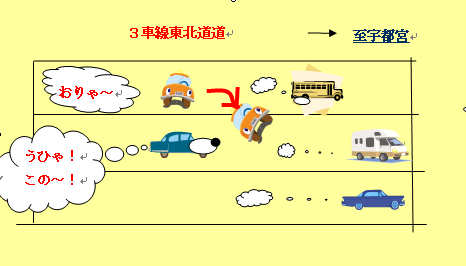 快適に東北自動車道を疾走していた。空は晴れ、風景をどんどん後に飛ばし、平日のせいか車の量もさほど多くなく、110キロ~120キロで奥日光目指してのドライヴ旅行だった。 と、突然やや左後から接近して来た乗用車が、左から私の目の前に飛び込んで来た。この間に突っ込んで来た。 この画像は、暴走車が突っ込んで来る直前、助手席の女房がシャッターを押したものである。 いやあ、びっくりしたよ。左横後方から接近して来た車の前方には、100キロ位で走行している大型車がいたのだ(写真参照)私はこの大型車を抜こうと、当然アクセルを加速していた。100キロ走行中の大型車を抜こうとしているのだから、当然スピードメーターは、110キロ~120キロを指していたものだと思う・・・ ヴゥオ~~ン~~って、不気味なエンジン音と共に、私の目前に後方から迫って来た車が突っ込んで来た。 ウワウワウワ~ッ!!私は一瞬目を覆った・・・衝突だ~っ!・・・もう駄目かと思った。 120キロ走行で急ブレーキは厳禁だ。ましてすぐ後方には、車が繋がってついて来ている。 咄嗟の判断で、ブレーキを小刻みに間断なく踏んだ・・・正常走行に戻った。 私は怒りと抗議のパッシングをした。その暴走車からも、謝りのパッシングがあった。やれやれ、いち時は命の危険に遭遇した走りだったけど、何とか収まり、今の目的地奥日光へと向かった。 次は奥日光ドライヴの旅と題して、続く・・・イロハ坂、華厳の瀧もあるでよ(^―^) 乞うご期待!