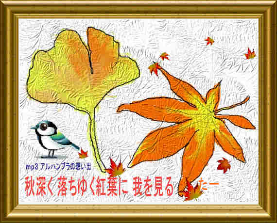 画像をクリックして下さい。 MIDIは、 アルハンブラの想い出を挿入。(音声ご注意) 「年々歳々花相似たり 歳々年々人同じからず」 花は毎年生まれ変わり 変わらない姿をみせるが、人は毎年歳をとり 歳とともに老けていくので、悲しくもあり寂しいものである。 そこで、深まりゆく秋に因んで一句。 ”秋深く 落ちゆく紅葉に 我をみる” この画像は、水彩ソフトで描いたものである。 更に、フラッシュソフトで加工してみた。