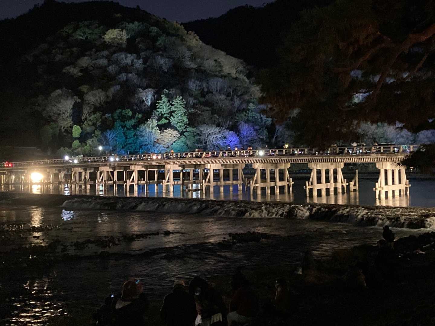 今日は10/10に行ってきた、京都の嵐山月灯路の写真を載せようかと。『嵐山月灯路』京都・嵐山の冬の風物詩として知られたライトアップ事業「嵐山花灯路(はなとうろ)」が、約4年ぶりに「嵐山月灯路」としてよみがえる。京都市の財政難などで、2021年度に幕を下ろしたが、地元住民らの手で復活。10月1日から1カ月間、竹筒や竹細工のほのかな明かりが、観光名所『竹林の小径(こみち)』を照らす。『嵐山花灯路』には2回行ったことがあるのよね。こんな感じなんだけど。とてもよかったライトアップイベントだったから、財政難を理由に終了しちゃったときはとても残念で×××それが今年、形を変えて復活 ! ! !有料化(一部無料エリアあり)されたけど、行く行く♪と、喜び勇んで行ってきちゃった♪♪♪≧▽≦10/1017時半過ぎ渡月橋17時50分頃無料エリア竹林のライトアップ竹林を抜けて、野宮神宮の横を通り、JRの線路を渡ると、有料エリアの竹林が・・・やってる、やってる♪竹細工を用いたライトアップ。*´▽`*入り口18時からというアナウンスだったけど、ここに到着したのが17:59。とっくに始まってたわ。;・∀・人が多かったから、さっさと始めたんだと思う。ちなみに当日券は長蛇の列。アタシは前売りを購入済みだったので、スムーズに入場。(=゚ω゚)ノ一番最初はコレ。カラフルなのは花々。お次はコレ。竹に模様を彫って、竹の中を光らせてる。こーゆーの、名古屋の徳川園でも見たし、地元の岡崎城公園でも見たわね。まあここの方が数が多くて、格段に豪勢だけれども。^ ^模様違い。竹林竹林の隙間から、ムコウのライトアップが見える・・・後編に続く。この嵐山月灯路は明日10/31まで。また来年もやってほしいな~と思っていたんだけれども、数日前に、この近辺でクマの目撃情報が。(汗) 嵐山にも クマがいるのか ! ! ! ;゚Д゚ちょっと怖くなってしまったのだった×××Σ(・ω・ノ)ノ!