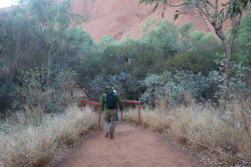 ウルルへ登山するには以下の条件が1つでも当てはまると登山禁止になります・最高気温が36度以上の予報が出たとき・風速25ノット以上の強風が吹いているとき・雨が降っていたり表面が濡れていたりするとき・雷が予報されるとき・頂上付近が雲に覆われているとき・アボリジニの文化的理由や儀式があるときここ数年の登山解禁日は年100~150日・・登頂確率が平均30.8%という低さですちなみに登山率が高いのは5~8月でそれでも40~50%くらいさらに登山ができる時間も限られています【3月〜11月】午前7:00~午後5:00【12月〜2月】午前6:30~午前8:00真夏は朝のみ!暑すぎるのでしょう・・2019年10月26日からは正式に登山禁止となります・・エアーズロックはもともとオーストラリア先住民アボリジニの聖地でしたがオーストラリア大陸に入植したイギリス人により略奪・・その後白人によるアボリジニに対しての迫害が起こりエアーズロックも長いあいだ返還されることがありませんでしたが1985年にようやく返還されました1985年以後は賃貸契約を結ぶ形で引き続きオーストラリアが観光地として管理しています ウルルへの登頂が禁止となった理由は2つ・・1つ目は聖地をけがす行為にアボリジニが難色を示したため観光客が多くなるとどうしてもゴミの不法投棄や落書きが増えますトイレもないので糞尿をする人も・・また毎年のように登山中に観光客が落ちて亡くなっていました1950年代以降少なくとも37人がウルルの登山中に亡くなっています最近では2010年に死亡事故が発生しています2018年7月には日本人男性(76歳)が登っている途中で倒れヘリコプターによって近くの医療センターに運ばれたもののそこで死亡が確認されたそうです・・(病死だったようです)もう1つは登る人が年々減ってきたため・・昔と比べると現在は登頂者が3分の1程度に減ってきたようですこれらの要因により先住民などで構成する運営委員会により全会一致で登頂禁止が決定しましたベースウォークエアーズ・ロックにはセイクレッドサイトと呼ばれるアボリジニにとって歴史的な重要な意味をもつ場所がいくつかあり立ち入ることや写真撮影が禁じられていますベースウォークのルート上にその旨指示が書いてありました登山口が閉まっていたので私達はベースウォークを歩くことに画像上がウルル全体の地図・・マラウォークは地図で見ると左上のエリアで片道1km程度・・1時間くらいで往復できます・・ここには「マラ族」の生活した洞窟があるので「マラウォーク」と・・ Teaching Cave(教室)何世代にもわたりアボリジニ(アナング族)の長老たちがこの洞窟で生き残りの方法を教えました手前の白いものはオリーブの葉奥のニョロニョロのような手を広げたものはトカゲと言われています・・The Men’s Cave(男性の洞窟)岩の模様が人が並んでいるように見えます男たちはここで儀式の準備などをしていたようです The kitchen cave(台所の洞窟)女性はブッシュから食べ物を採取しここに戻って女の子や小さな子供と過ごしながら調理していたようです天井の所々にゴツゴツした塊が見えます水で溶け出した岩の石灰分で形成された鍾乳石のようなものでしょうか・・ここにも壁画が描かれています・・ここで一人旅をなさっている日本人女性と出会いました笑顔がとっても素敵な方でした・・ Old people’s cave(長老たちの洞窟)天井が黒くすすけているのは長老たちが囲んだ焚き火をしたあとでしょうか・・長老たちは男たちの儀式の間ここで休みながら女性や子供が儀式の場に入らないように見ていたそうです・・Oさんご夫婦とクマさん・・ウルルの大きさがわかりますね・・Kantju Gorge(カンジュの滝)マラウォークで最後に見えてくるのは「カンジュの滝」ここは貴重な水場として使われていたそうです近くで見るとかなりの高さがありましたカンジュ渓谷の水はマラ族だけでなく動物たちにとっても貴重な水場とのことここに水を求めてやってくるエミューをマラ族は狩ったそうです カンジュの滝を見た後は来た道を引き返し駐車場まで戻ります9時05分・・駐車場まで戻ってきましたこれからエアーズ・ロックリゾートに戻り・・朝食です・・続く・・FC2はこちらから