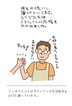 かたや、うちのミケルくん(仮名)は、昔、喫茶店でアルバイトをしていたとき、身につけた特技らしいのですが、野菜を薄く切ったり細く切ったりするのが得意です。