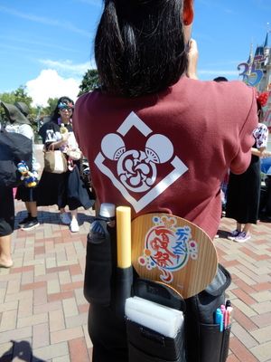 カメラマンのお姉さん、ミッキー家紋のポロシャツ。うちわ。