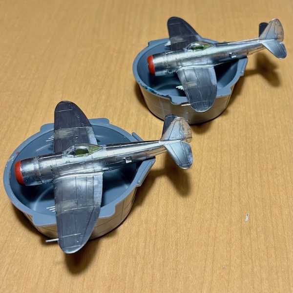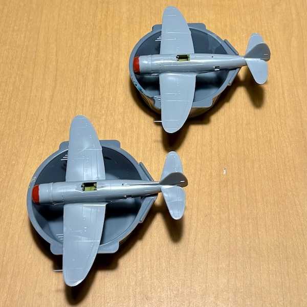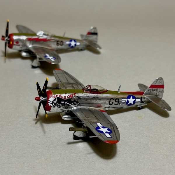 デカールを貼り終えて最後にランディングギアや兵装を組み立てて取り付けます。これ最初の頃、説明書通りに先にランディングギアとかを取り付けてデカール貼りを行った処、ランディングギアを折ってしまったことがありました。それと下面を塗装する際もランディングギアが付いてると乾かしやすいとゆうこともあり。プロペラもランナーから外して先に着けてしまうとデカールが貼りにくく;汗。で、気をつけなきゃいけないのが主翼のピトー管や機銃、胴体のアンテナなどを折ってしまうこと。実際このP-47の1機も手から滑って落とし、ピトー管を折ってしまいました;泣。ランナーを伸ばして作って修理、伸ばしたランナーで作ったピトー管を主翼に付けるのですが、ただ貼り付けるのではなかなか定着しません。そこで主翼に穴を開けピトー管を差し込むように取り付けます。これがまたこのサイズで主翼とは言えほぼ厚みがなく穴を開けるのにも苦労します。ランディングギアや兵装を付け終わってから貼り終えたデカールにフラットクリアを塗って艶を消します。キットのデカールはピカピカでオリーブドラブのアンチグレアなどひかり過ぎてアンチグレアの意味をなしませんwwwまたデカールの暗赤色が艶があることによって、このデカールの色に合わせて塗った艶消しの茶色と色が違って見えます。デカールの暗赤色部分を艶消しにすることによって塗装した茶色と近い色調になりました。そして最後の最後両主翼の先端にある赤と緑(青の指定がありますが緑にしてます)のナビゲーションライトを塗ってホントに完成!もうこの瞬間やっと作り終えた~と一気にどっと疲労感を覚えると同時に安堵するのでした。このサイズ1/144は神経使うなぁ;汗。