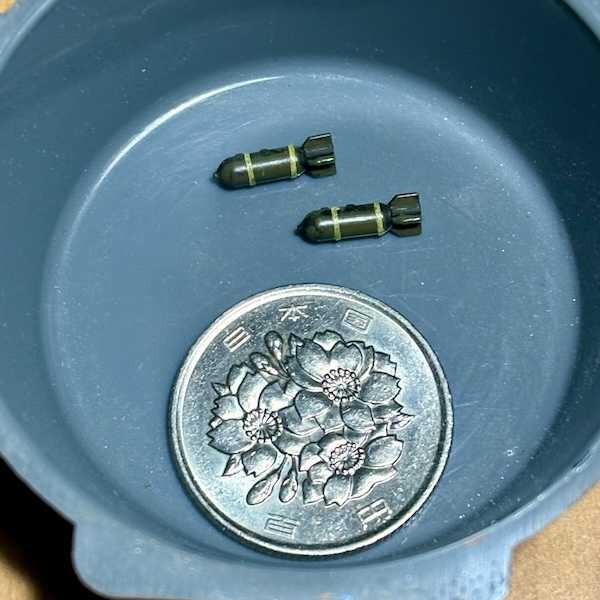 キットにはオプションで爆弾とロケットチューブが取り付けられるようになっています。1機はフル装備にしてもう1機は兵装架だけにしようと思います。説明書の爆弾の塗装指示ではオリーブドラブだけの塗装で黄色のラインの指示はありません。色々と資料を見てみると爆弾に黄色いラインが2本入っています、キットの箱絵にもラインがあります。これはラインを着けなくては!かと言ってこのサイズに綺麗にラインを2本も入れるのは至難の業、あ!マスキングテープの色が黄色♪そこで手持ちの一番細いマスキングテープ、0.4mm?を貼ればいいじゃんとwww実際に貼ってみるといい感じです、今回は黄色いテープをそのまま貼りましたが、欲を言えば予めマスキングテープを予め黄色く塗ってから貼れば完璧です。マスキングテープの厚みも薄いのでこのサイズでも気になりません。1/144ではこんなラインも要らないかもしれませんが、、、。アイズプロジェクト(aizupro) ミクロンマスキングテープ1 0.4mm幅×8m巻 模型用資材 プラモデル用品