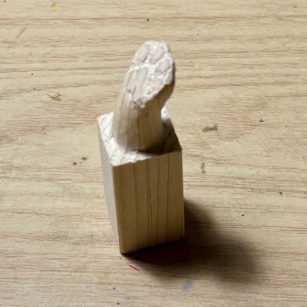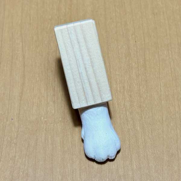荒削りを終えて徐々に細部を彫り進めていきます。肉球を彫ります、、、ここで前足と後ろ足では肉球の形が微妙に違う事を発見!今までに作った「ねこ手スタンプ」ではあまり意識していませんでした;汗。前足の肉球が後ろ足の肉球より若干小さいようなのです、「掌球」と呼ばれる真ん中のクッションの役目をする肉球もちょっと形が違います。これに気づいたのはある程度肉球を彫ってしまってからでしたが、後で石粉粘土を盛るのでその時に修正しようと。ある程度彫ってから胡粉入りのジェッソを塗ります。胡粉とは貝殻から作られる顔料で人形の地塗りにも使われるので普通のジェッソを使うよりいいんじゃないかと;汗。ジェッソの上から手のふくらみを付けるために石粉粘土を盛ります。猫の可愛らしい丸い手を意識してwww今回は意図せず何となくやや手を広げたような形になりましたが、手を広げた「パー」にするつもりならもっと広げます。下絵で裏に肉球を描いた際に肉球の間隔がちょっと開いたからかもしれません。これはこれで良しとします。石粉粘土が乾いてから少しスポンジヤスリをかけ、更に全体に胡粉ジェッソを塗ってここまでの工程は終了。量産とは程遠いペースです;汗。胡粉ジェッソ 50ml 白色地塗り剤 リキテックス Liquitex