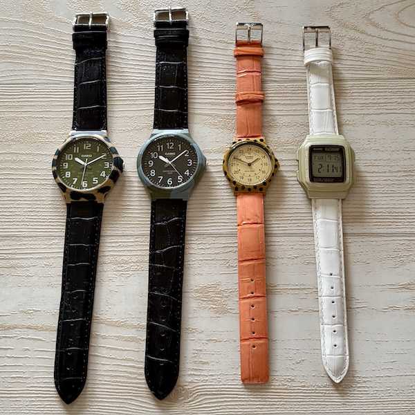 チープカシオのケースやバンドに自分で塗装してヤフオクに出品していましたが、今回バンドを交換して再出品しました。と言うのも右側に写っているF-201WAのバンドに溶剤が着いてしまい塗装の一部が剥がれてしまったので一旦全部塗装を落とし、再塗装をしようと思ったのですがちょっと面倒臭くなり;汗、バンドを既成の革バンドに交換しました。そこで他の塗装済みチプカシを見直している内に全部交換してしまえとゆう事になり交換しました。革バンドに塗装してもいいんですが、今回はバンドの塗装なしです。ケースの塗装はそのまま、バンドを替えただけで何やら良い感じにwww宜しければオークションページをご覧ください。チープカシオ カモフチープカシオ アニマルチープカシオ ポップチープカシオ シャンパンゴールドマイオークションページ