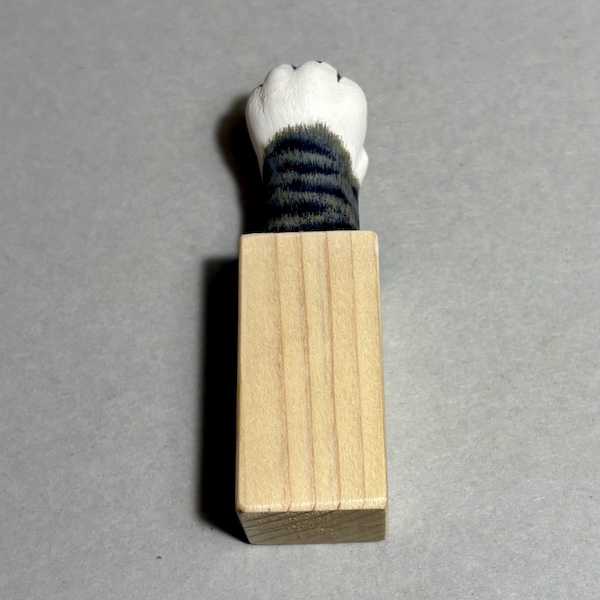 ねこ手スタンプに白サバトラの被毛模様を描きました。サバトラやキジトラでもいいんですが手先をちょっと白くした方がかわいい感じがしたので。グレーの下塗りをする際、最初に水で濡らしてアクリル絵の具を塗って自然にぼかしてみました。白の上のグレーの被毛は上手く行ったのでグレーの上に同様に水で濡らして黒を乗せて模様にしようと思いましたが上手く行かず、自然にぼかすのを断念。結局細い筆で毛の一本一本を手描きして行くとゆういつものパターンに;汗。プラモデルでこの方法をシンナーでやると比較的上手く行ったので今回採用してみましたが、水とシンナー、アクリル絵の具とプラモデル用塗料とでは勝手が違うようです。あ!ウェザリングマスターでぼかしても良かったかも、次回作る時に試してみます。最後に肉球のスタンプを押してみて捺印具合を調整して完成。持ち手の木の部分にサテンバーニッシュを塗って保護、ねこ手の部分にサテンバーニッシュが着いたら光ってしまったのでねこ手部分にはマットバーニッシュを塗って完全艶消しに。オークションに出品しましたので宜しければご覧ください。ねこ手スタンプNo.03マイオークションページ