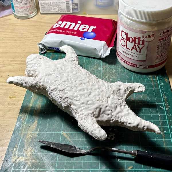 表面のクロスクレイが乾いたので四肢と尾を普通の石粉粘土で作ります。